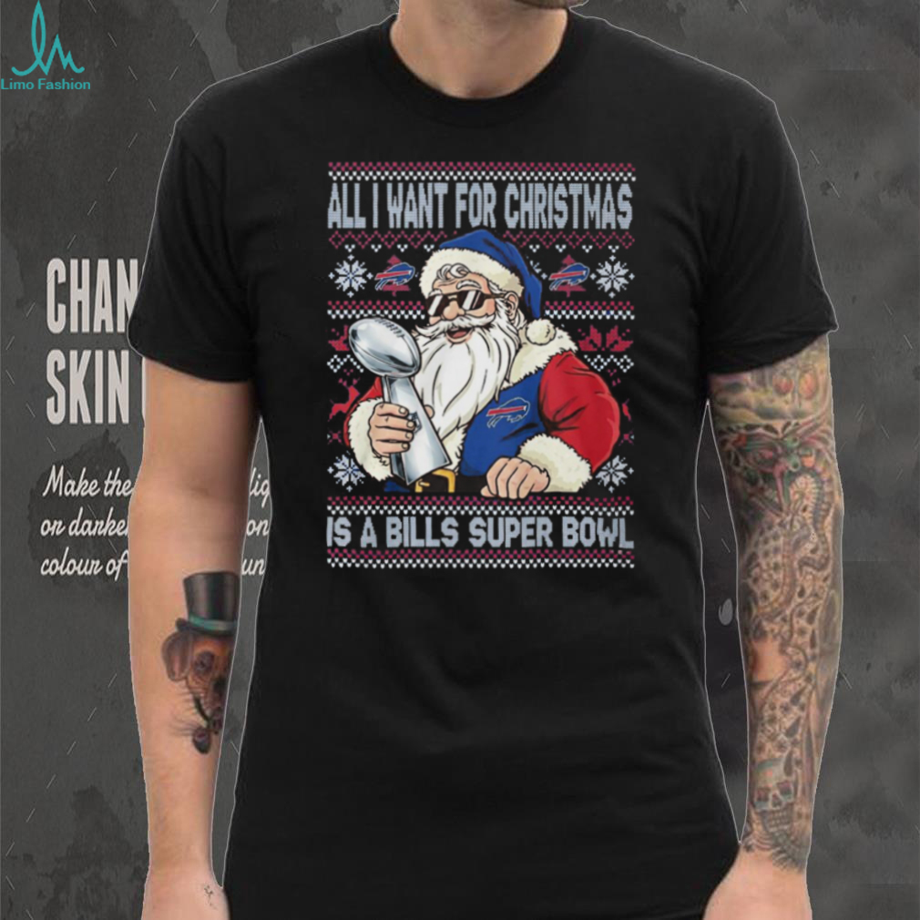 Imagine the joy of unwrapping the perfect gift, a shirt that combines your love for the Buffalo Bills with the festive spirit of Christmas, all wrapped up in a wonderfully ‘ugly sweater’ design! This isn’t just any holiday tee; it’s a playful declaration of your unwavering hope for a Bills Super Bowl win, even during the most wonderful time of the year. It’s for the fan who brings humor and passion to every holiday gathering, a cozy conversation starter that perfectly captures your “all I want for Christmas” wish. Get ready to spread some serious Bills cheer, festive style!