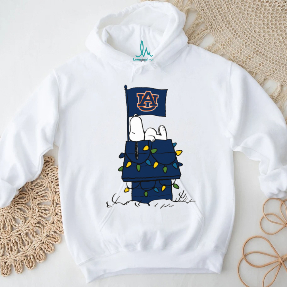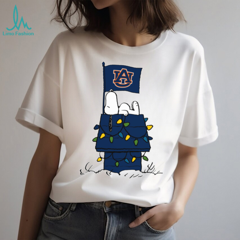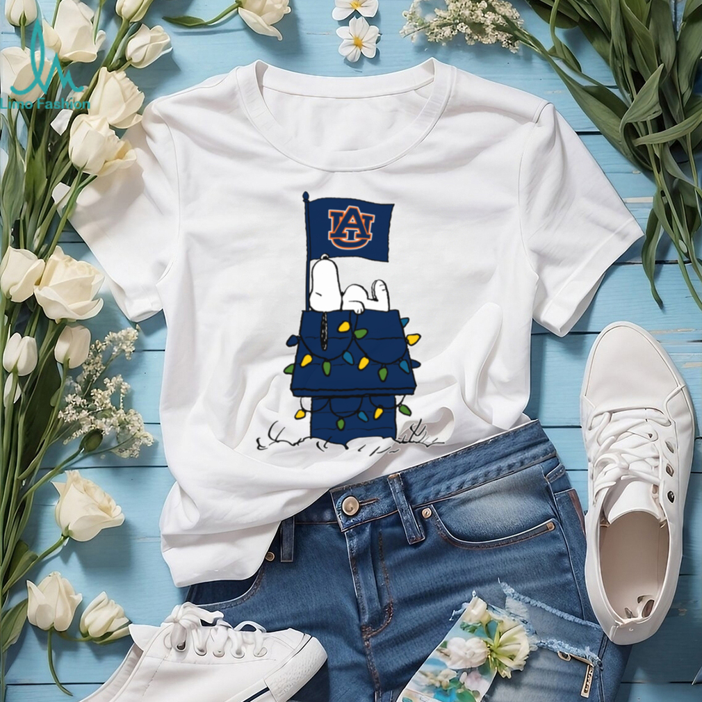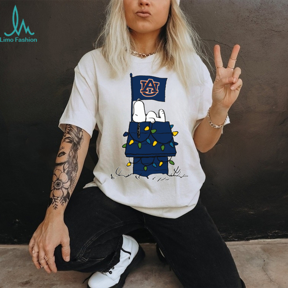 This festive Auburn Tigers holiday shirt is crafted from a soft, comfortable cotton blend, making it ideal for everything from cozy holiday gatherings to cheering on the Tigers during bowl season. The design, as seen in the first image, features Snoopy’s iconic doghouse decked out in Auburn’s signature orange and blue lights, with the beloved beagle himself enjoying the holiday spectacle. It’s a playful nod to both classic cartoons and college football, solving the search for unique fan apparel that stands out from the typical gameday gear. This tee offers both comfort and a cheerful design, ensuring you look and feel great while showcasing your dual fandom.