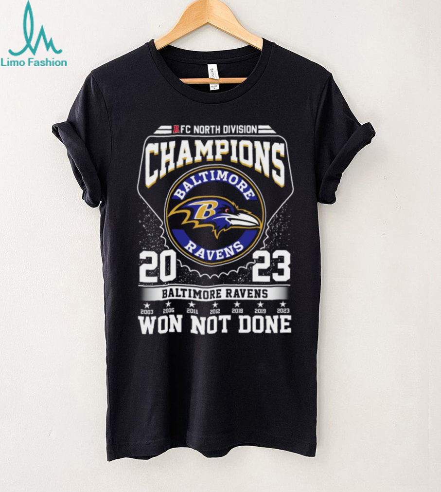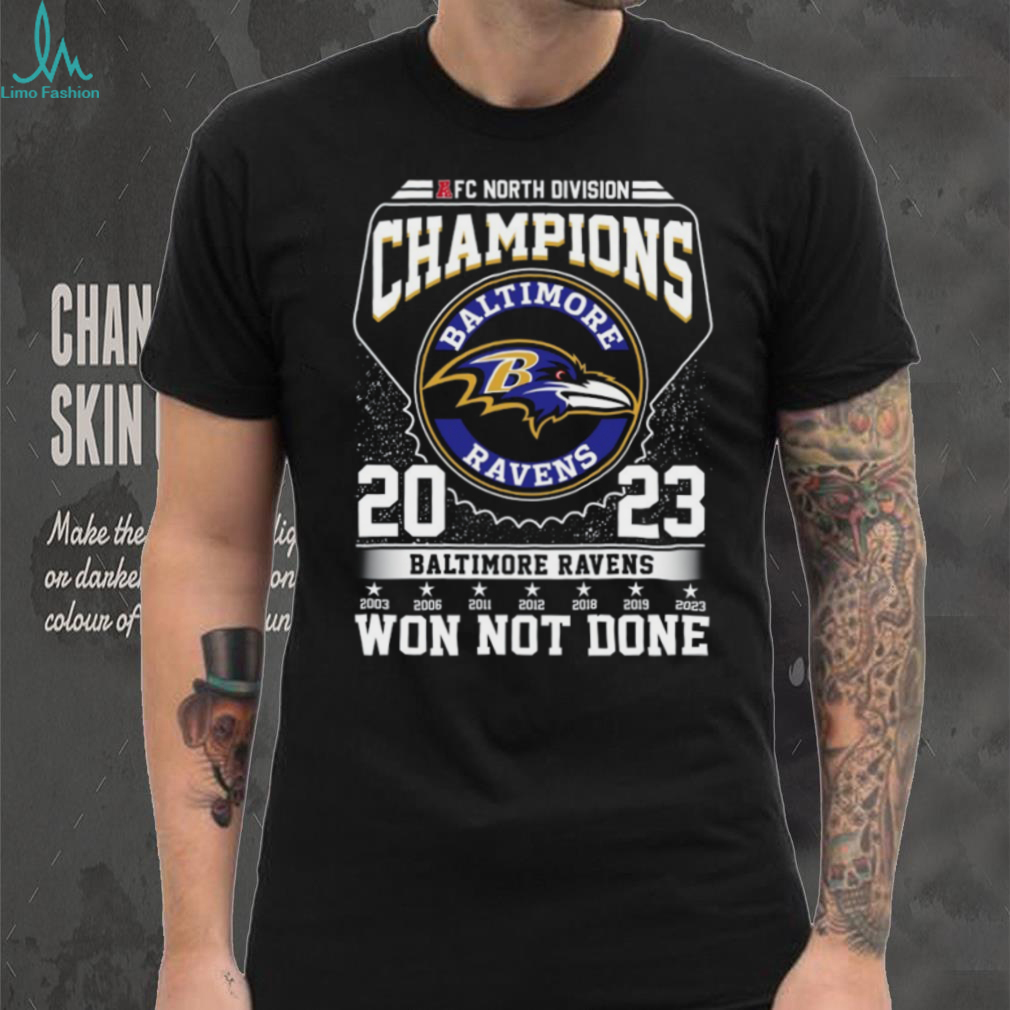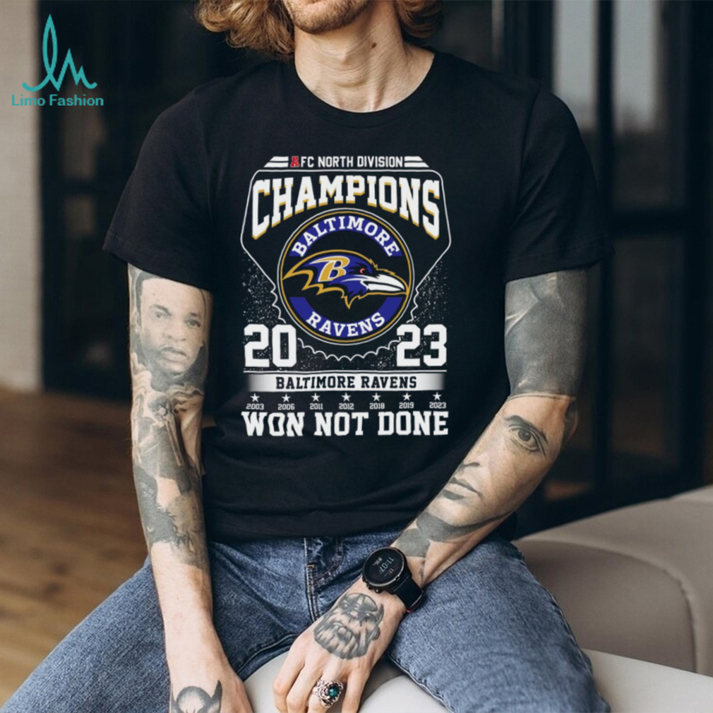 To keep your Baltimore Ravens 2023 AFC North Division Champions T Shirt in championship condition, wash it inside out in cold water with similar colors. Tumble dry on low heat or hang dry to preserve the vibrant print and fabric. Avoid ironing directly on the design.