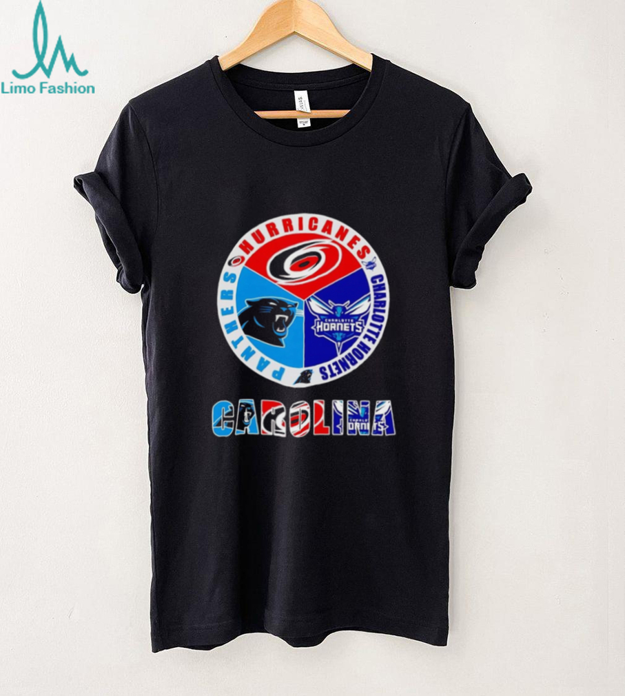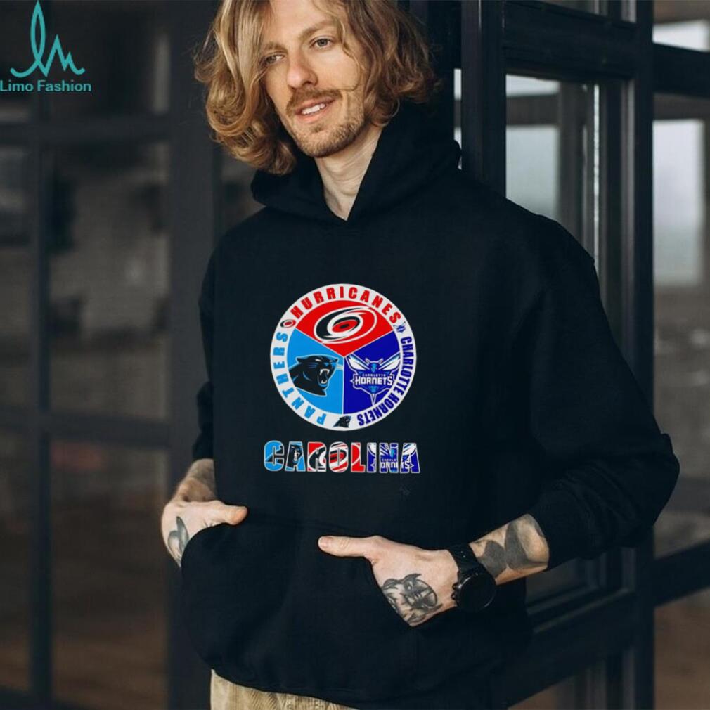 Show your Carolina pride with this ultimate sports fan shirt! This tee features the logos of the Carolina Hurricanes, Charlotte Hornets, and Carolina Panthers. Imagine sporting this shirt around town, repping all your favorite teams in one stylish design. Perfect for any Carolina sports enthusiast, this shirt is a must-have addition to your wardrobe.