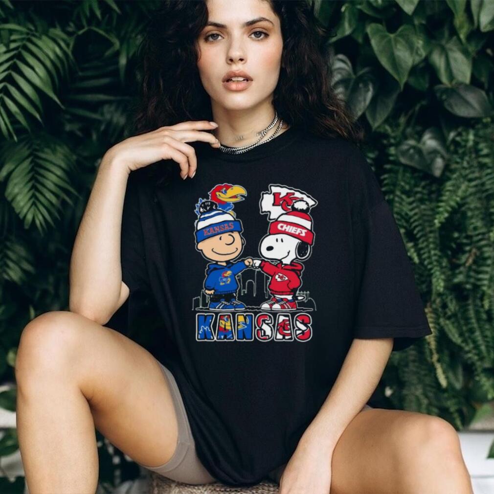 • This item: Charlie Brown and Snoopy Kansas Jayhawks & Kansas City Chiefs T Shirt Original price was: $28.99.Current price is: $21.95.