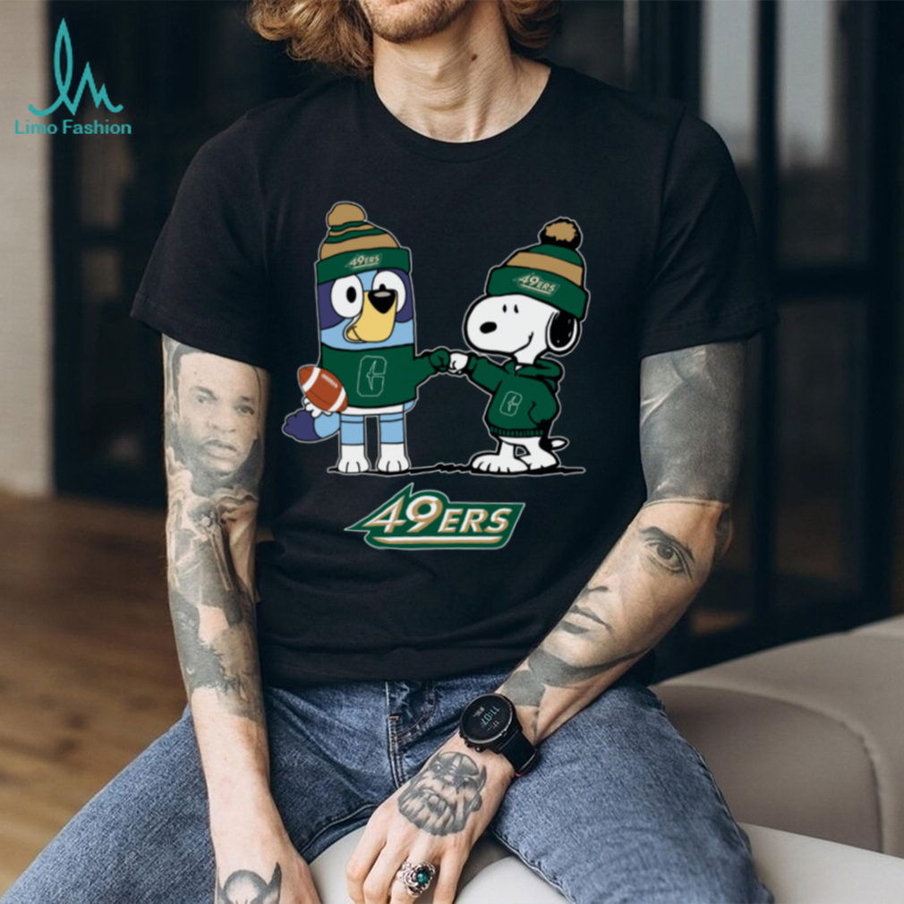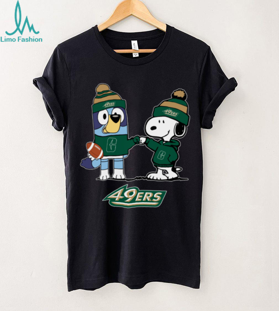 Get ready for some holiday football cheer with this adorable Charlotte 49ers Christmas T-shirt! Featuring Snoopy and Bluey in their 49ers gear, this tee is the perfect way to show your team spirit during the festive season.