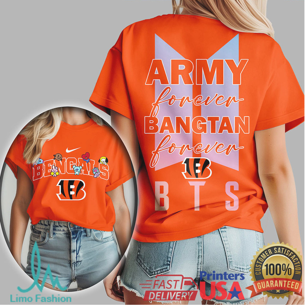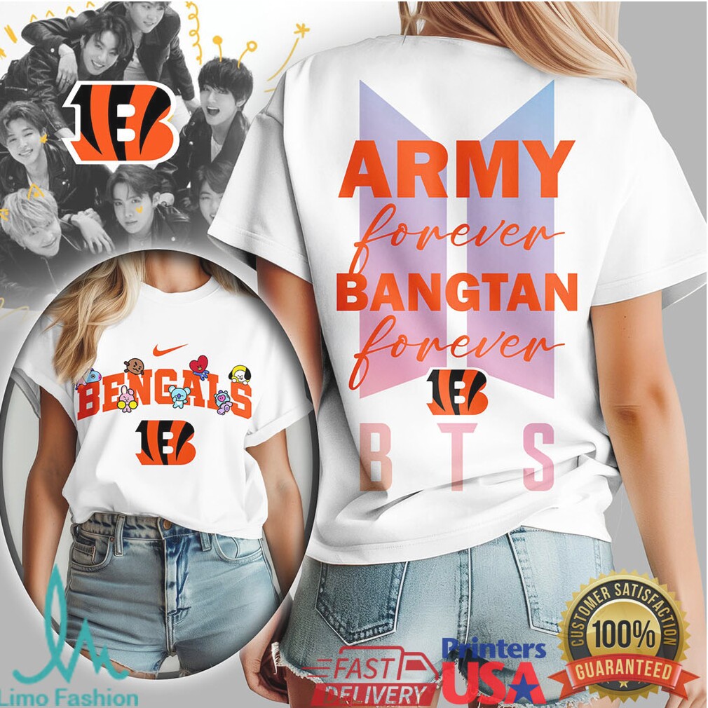 Imagine game day vibes meeting your favorite K-pop anthems. For the female fan who cheers on the Cincinnati Bengals with the same passion she has for BTS, this shirt is designed just for you. It’s a playful yet stylish way to showcase your diverse loves, blending the thrill of NFL football with the global phenomenon of K-pop. This isn’t just fan gear; it’s a statement of your unique personality and an instant conversation starter, perfect for those who dare to stand out in the crowd.