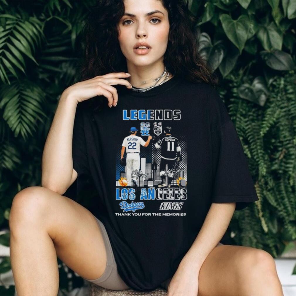 Pay tribute to two Los Angeles legends with this unique Clayton Kershaw x Anze Kopitar “Thank You For The Memories” T-shirt. Celebrating the careers of these iconic players from the Dodgers and Kings, this tee is a must-have for any true LA sports fan. Show your appreciation for their contributions to the city with this special memento!