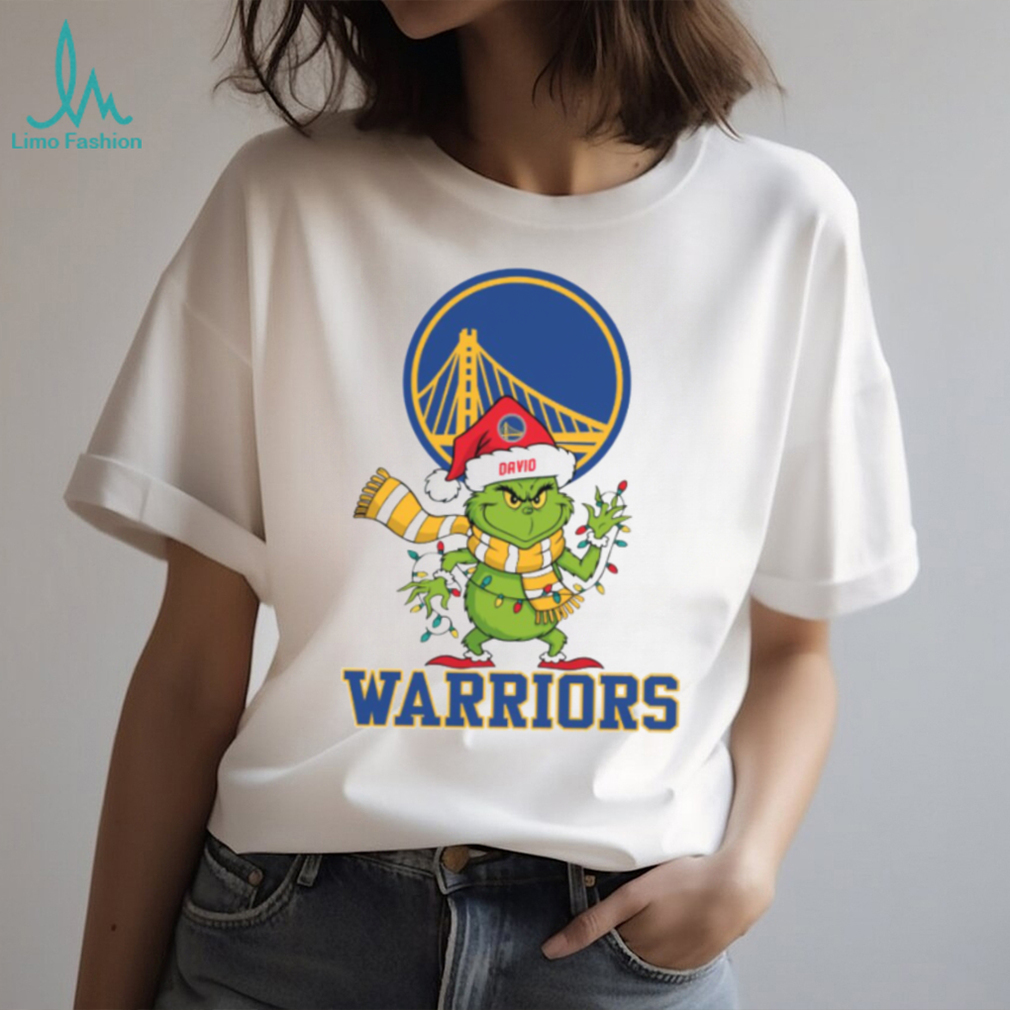Custom Warriors Christmas Tee, Grinch Holiday Shirt with Santa Hat Lights Scarf, Funny NBA Basketball Fan Gift