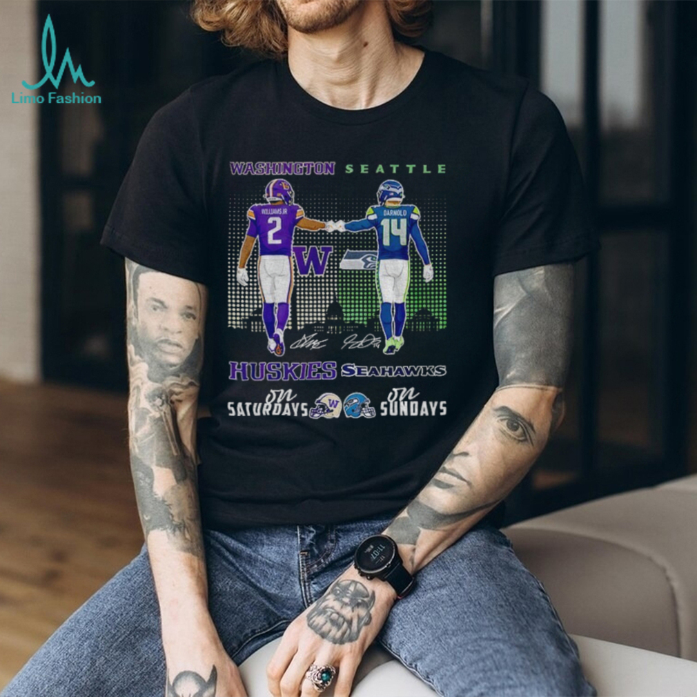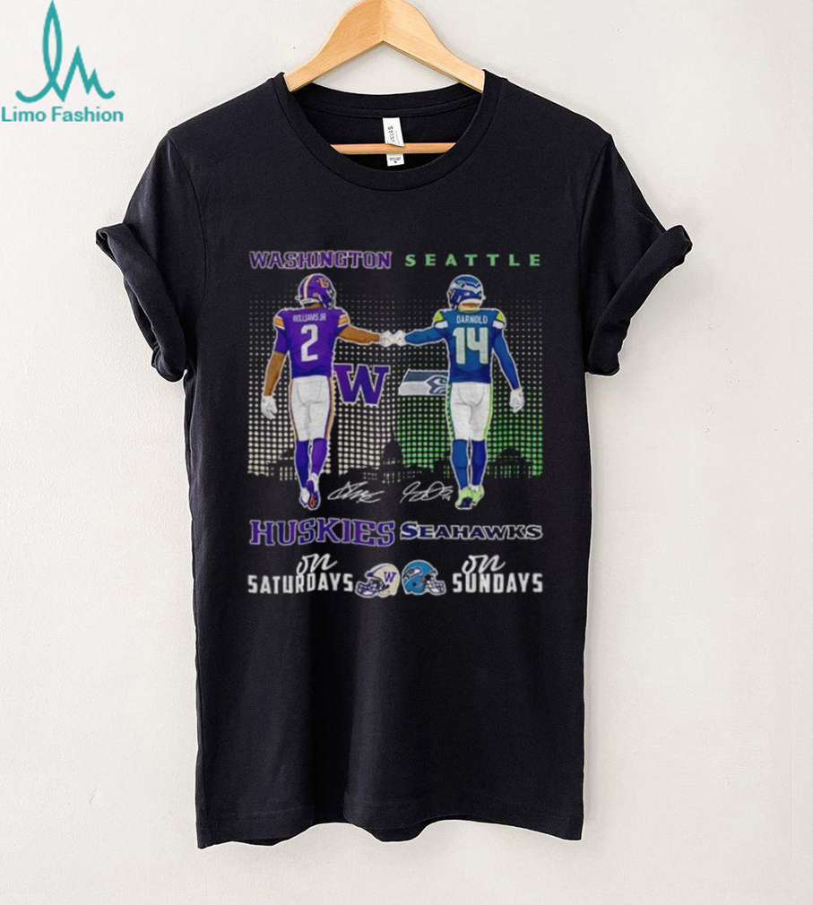 For the football fan who knows that the gridiron action runs from Saturday to Sunday, this “Demond Williams Jr. Washington Huskies vs Sam Darnold Seattle Seahawks” shirt is a perfect celebration of both worlds! It’s a unique design that brings together the excitement of college football with the intensity of the NFL, featuring signatures from two dynamic players. Wear it to show your appreciation for the game, no matter the league.