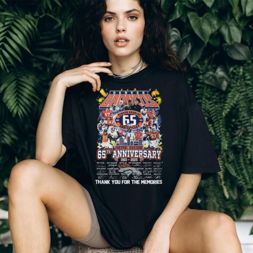 ()So when the Bad Bunny Super Bowl was announced, the reaction wasn’t just surprise; it was something closer to Denver Broncos 65th Anniversary 1960 2025 Legends Signatures T Shirt. Suddenly, people were saying they didn’t know who he was or that they couldn’t name a single song, claiming this was the least exciting pick in years. Some shrugged and said they’d just ignore it, while others were more pointed, wondering how we went from a Kendrick Lamar halftime show to this specific artist.