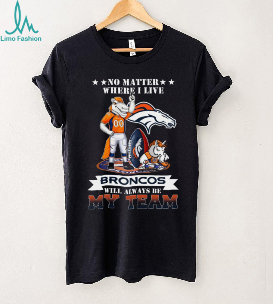 To keep your Denver Broncos No Matter Where I Live T Shirt looking vibrant, machine wash cold with like colors. Tumble dry low. Do not bleach or iron directly on the design.