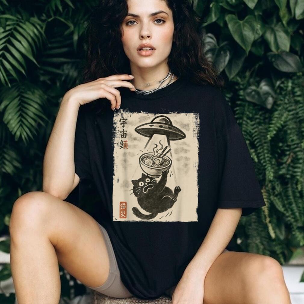 To keep your Cat Ramen UFO T-Shirt looking stellar, machine wash cold, inside-out, with like colors. Tumble dry low or hang dry to preserve the design’s vibrancy. Avoid ironing directly on the print.