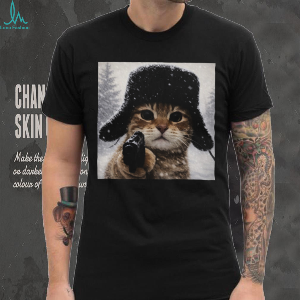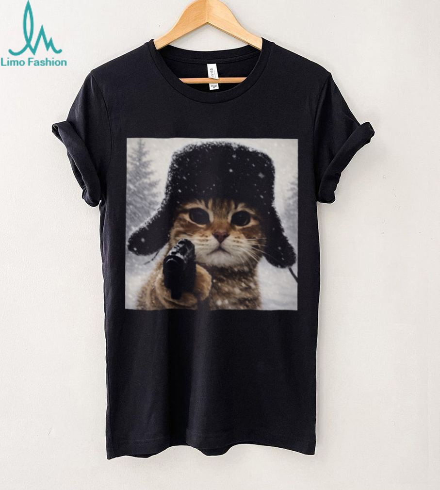 (Funny Gangster Cat with Gun in Snow Russian Hat Graphic T Shirt)Funny Gangster Cat with Gun in Snow Russian Hat Graphic T Shirt, Treat yourself or make a great gift for your loved ones