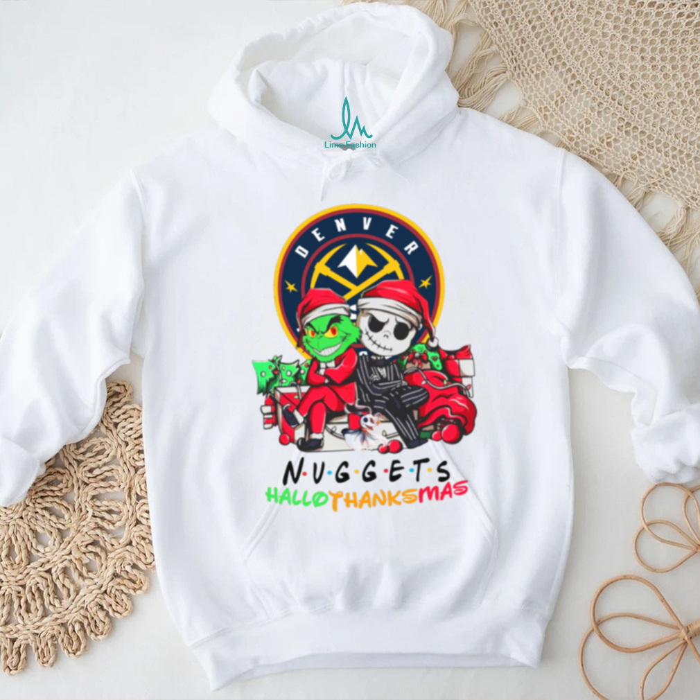 Combine your love for the Grinch and the Denver Nuggets with this unique HalloThanksMas T-shirt! This shirt is perfect for fans who want to celebrate the holidays and their favorite basketball team.