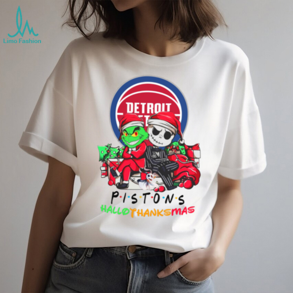 Celebrate the holidays and show your love for the Detroit Pistons with this fun and festive Grinch and Jack Detroit Pistons Friends HalloThanksMas T Shirt. This shirt brings together the Grinch, Jack Skellington, and your favorite basketball team for a unique holiday look.