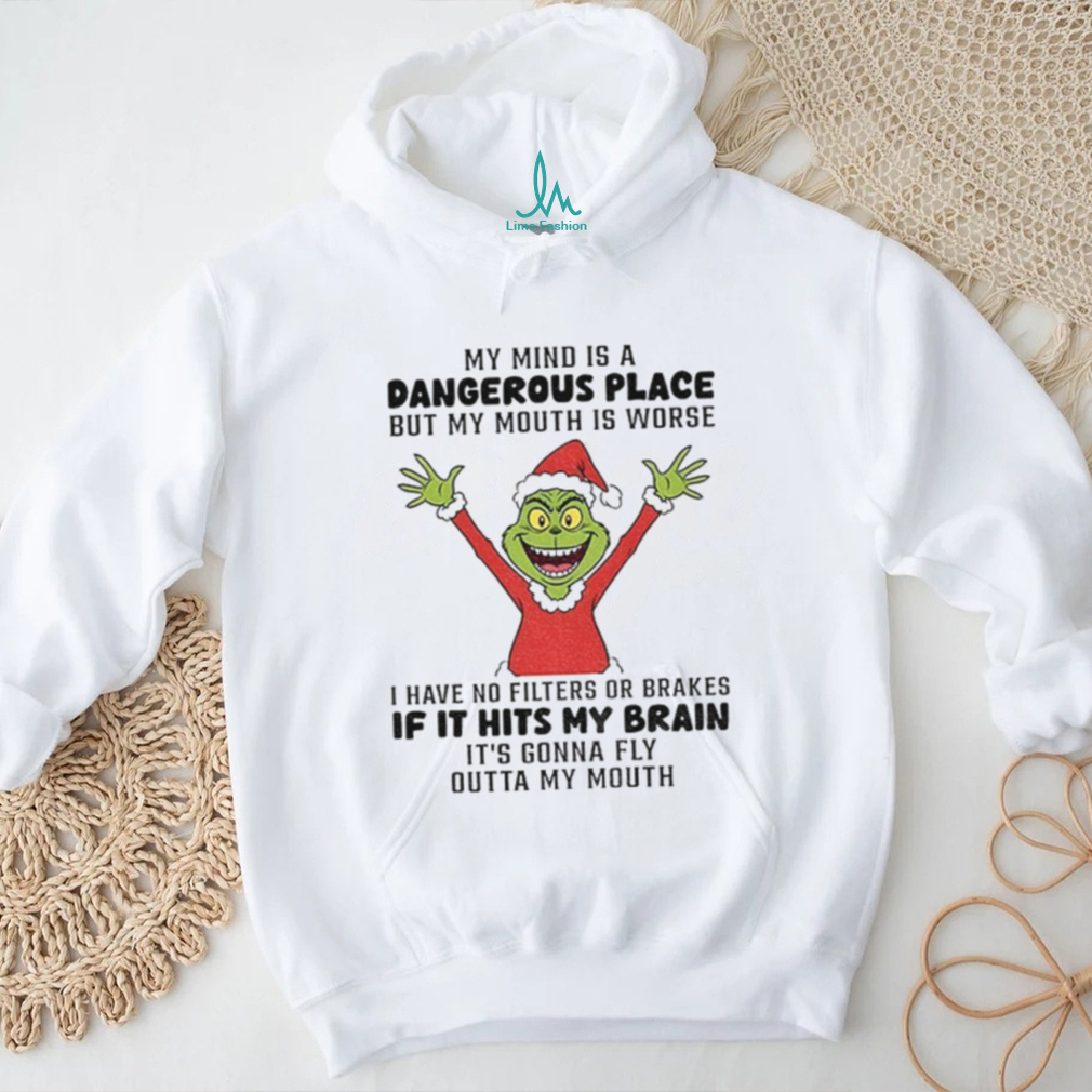 Grinch my mind is a dangerous place but my mouth is worse I have no filters or brakes if it hits my brain Christmas shirt