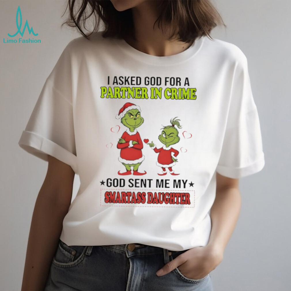 Looking for a Christmas shirt that perfectly captures the joys of having a smartass daughter? This Grinch Santa shirt says it all: “I asked God for a partner in crime, God sent me my smartass daughter.” It’s the ideal gift for proud parents this holiday season!