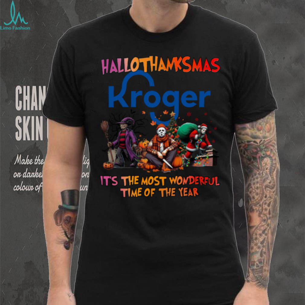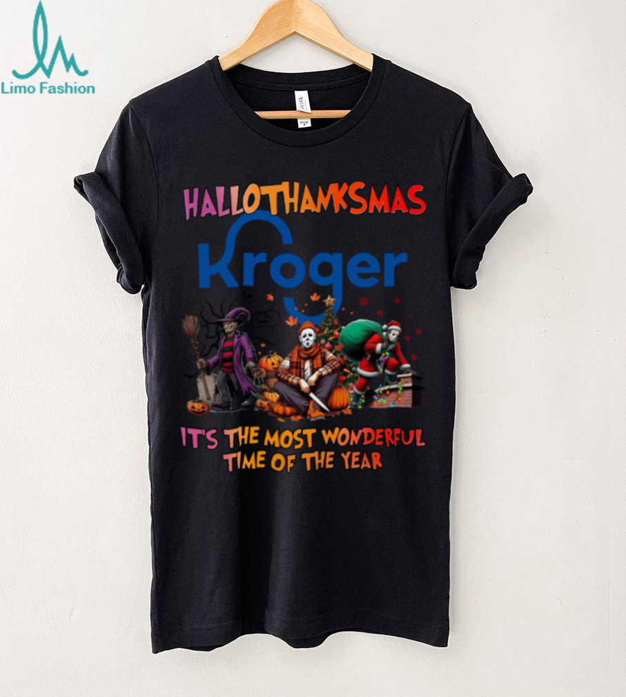 This Halloween Thanksgiving Christmas Shirt is a unique blend of holiday cheer and horror-movie thrills, all while giving a shout-out to Kroger! Featuring a clever design that mashes up iconic horror movie elements with festive elements, this shirt is sure to get some laughs. Made from a soft and comfy fabric, it’s ideal for grocery runs, holiday parties, or just lounging around. Show your love for all things spooky and seasonal with this one-of-a-kind tee!
