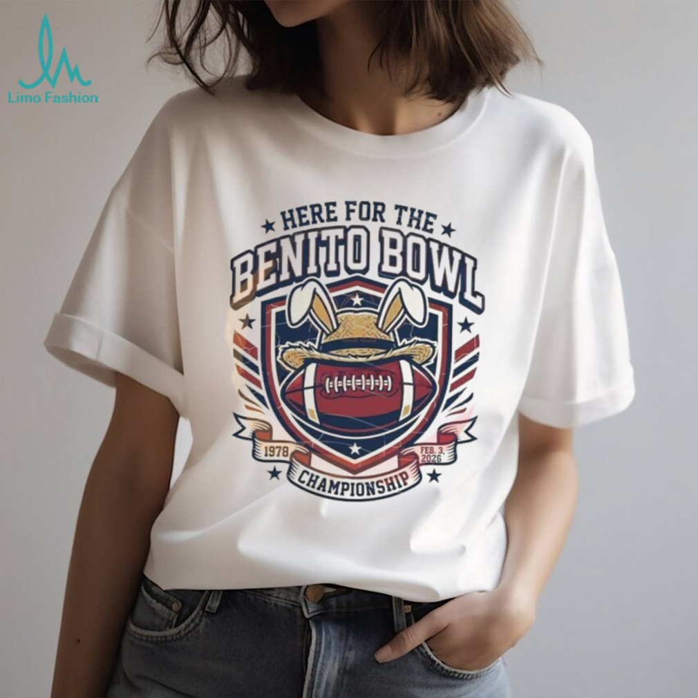 (Here For The Benito Bowl 2026 Championship T Shirt)Team Canada’s defensive pairings for the Milano Cortina 2026 Winter Olympics have been finalized, and head coach Jon Cooper is sticking with familiarity over experimentation. The top pair features Colorado Avalanche teammates Devon Toews and Cale Makar, widely considered the most dynamic duo in the NHL. The second pair consists of Josh Morrissey and Drew Doughty, providing a blend of elite puck-moving and veteran defensive savvy. The third pairing sees Here For The Benito Bowl 2026 Championship T Shirt together, with Colton Parayko serving as the seventh defenseman and primary penalty-kill specialist. In goal, Jordan Binnington is expected to get the start for the opener against Czechia on February 12, though Logan Thompson is looming large as a potential “crease thief” if Binnington falters.