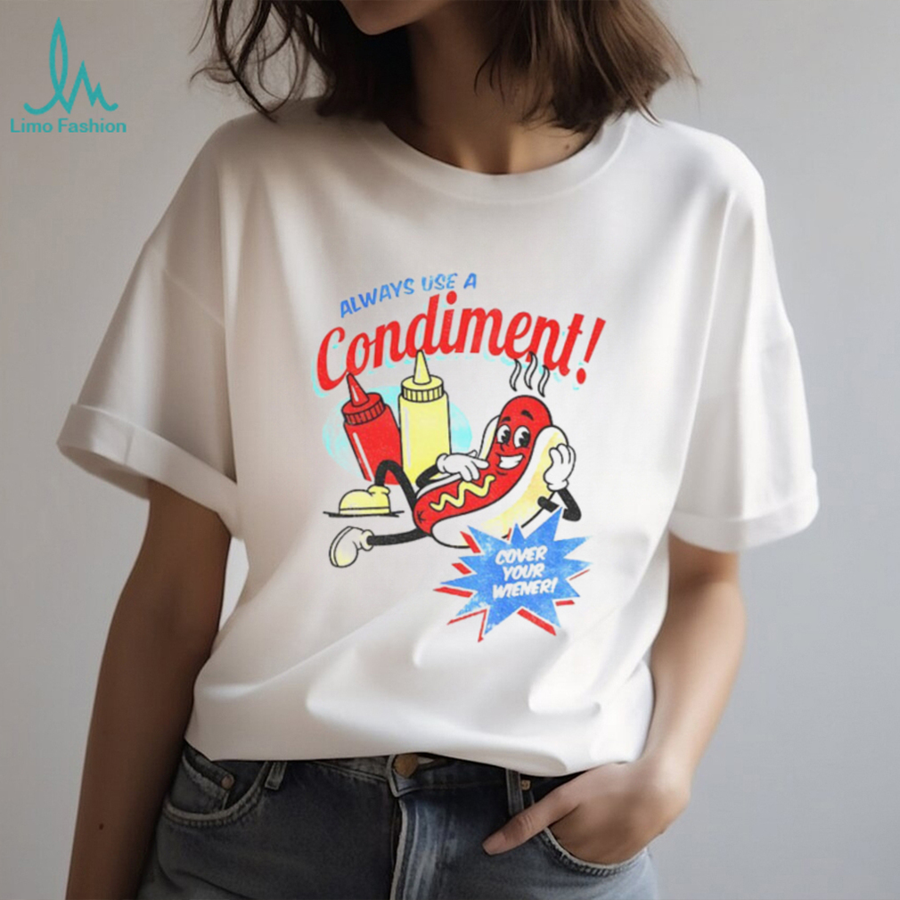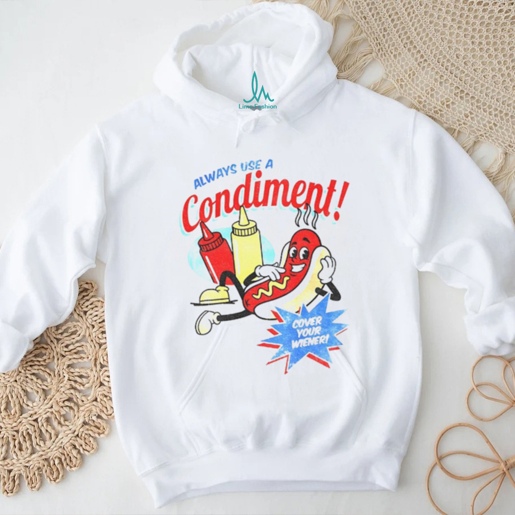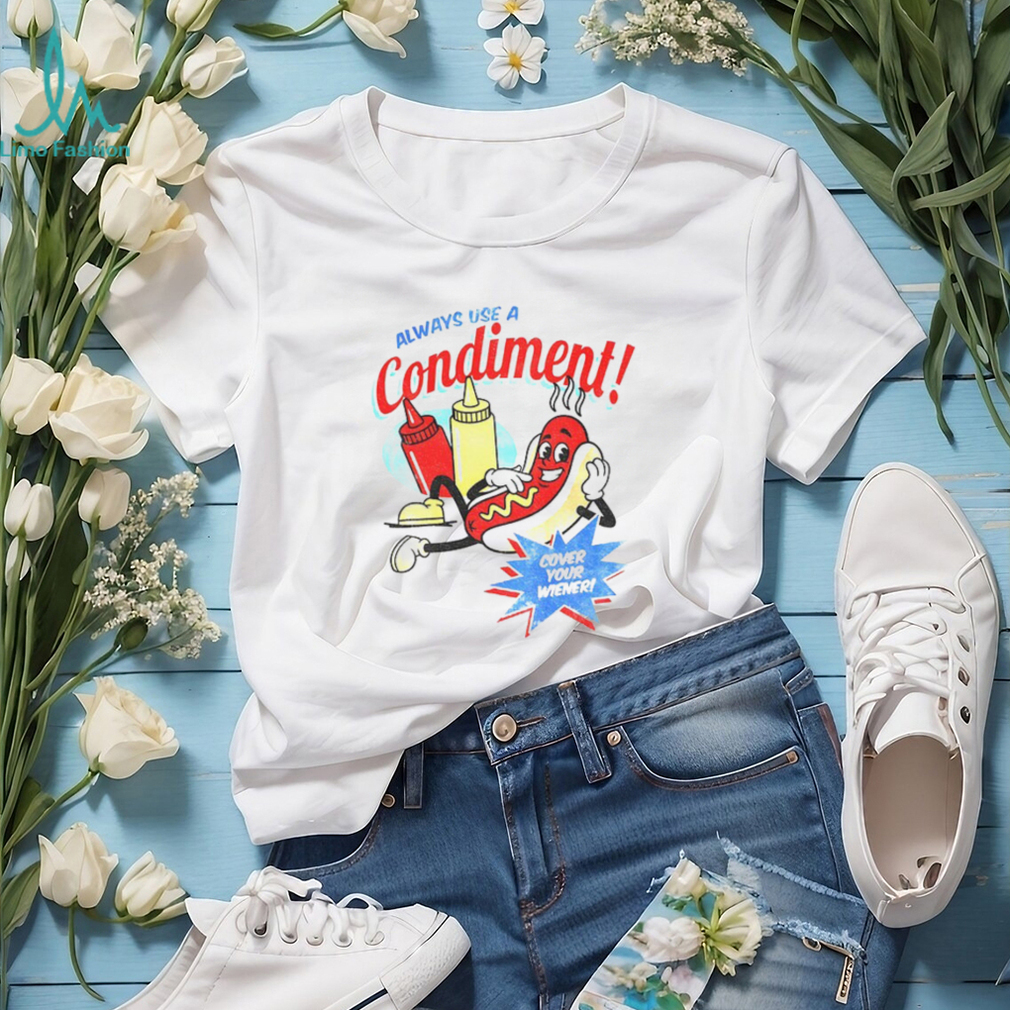 Ready to spice up your wardrobe with a dash of humor? This “Hot dog always use a condiment cover your wiener shirt” isn’t just a piece of clothing; it’s a statement. Imagine the laughs and head-turns as you stroll down the street, sporting this witty design. It’s the perfect icebreaker and a guaranteed conversation starter.