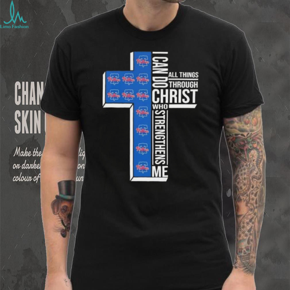 Show your faith and Phillies pride with this unique t-shirt! Combining the inspiration of scripture with love for baseball, this shirt speaks to those who find strength in both their beliefs and their team.