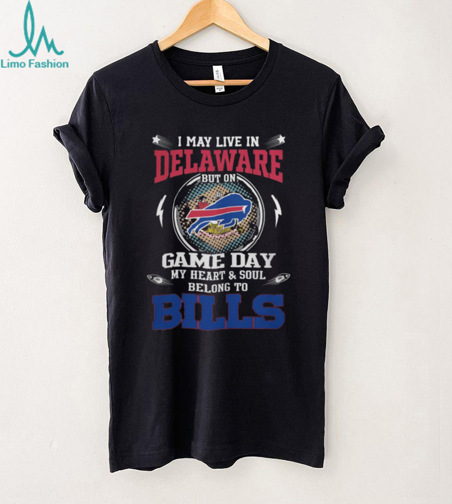 Show your Buffalo Bills pride, even if you’re stuck in Delaware on game day! This “I May Live in Delaware Game Day My Heart & Soul Belong to Bills T Shirt” is perfect for Bills fans living outside of Buffalo who still bleed blue and red. If you’re looking for a comfy, stylish, and witty way to represent your team from afar, this is the tee for you. Let everyone know your heart belongs in Buffalo, no matter where you live!