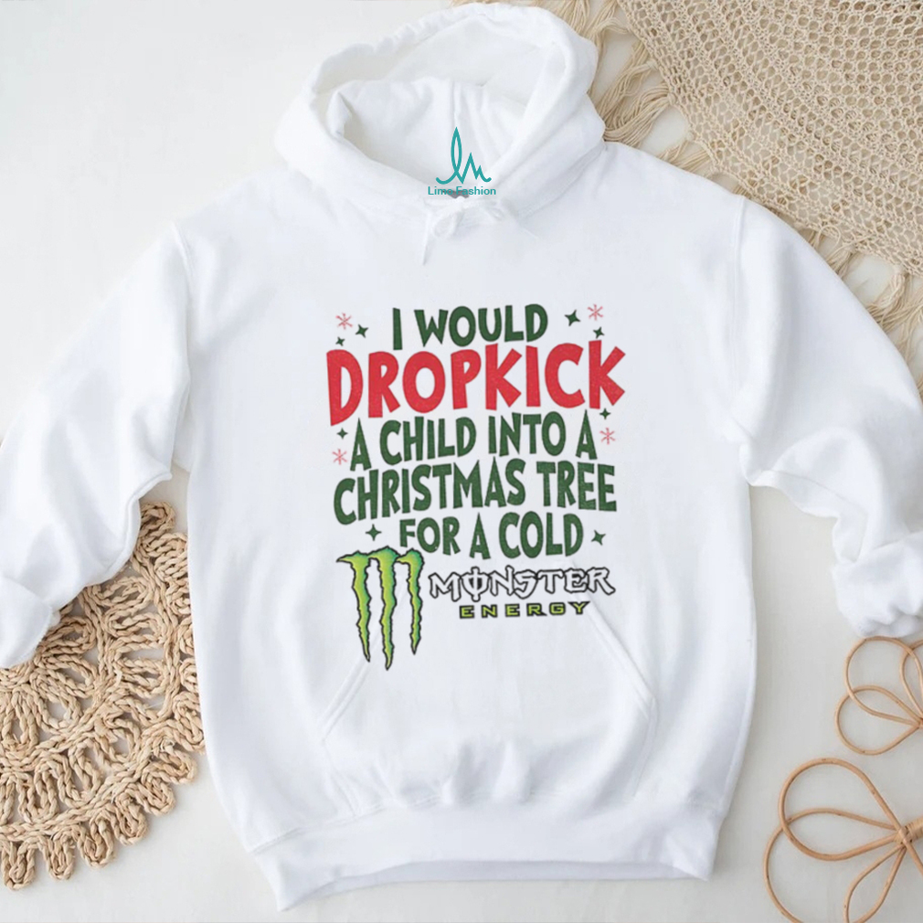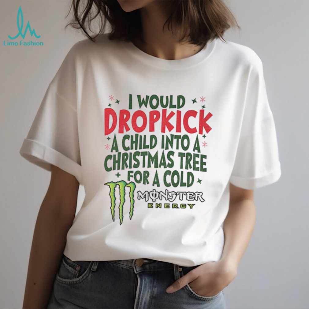 This isn’t your average Christmas tee. The “I would dropkick a child into a Christmas tree for a cold Monster energy Merry Christmas shirt” is for those who enjoy edgy humor and aren’t afraid to make a statement. It’s a fantastic way to express your unique personality during the holidays. The shirt is made with comfortable fabric, designed for a relaxed fit. Perfect for those who want to stand out at holiday gatherings or just lounge around with a cold Monster.