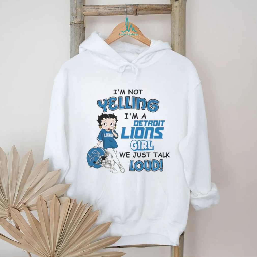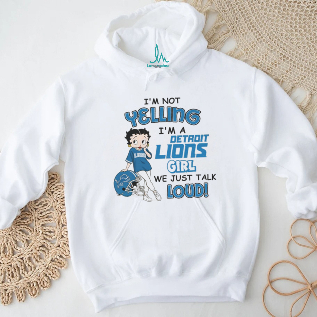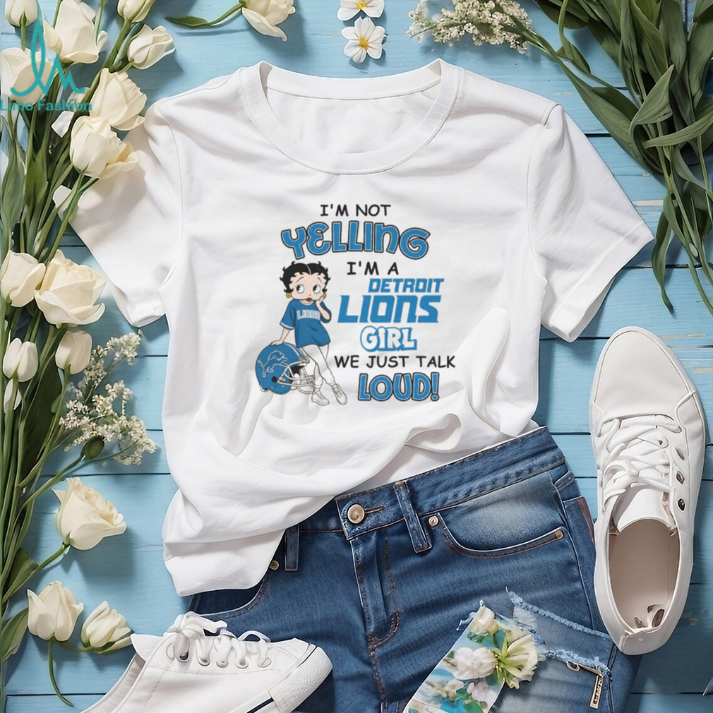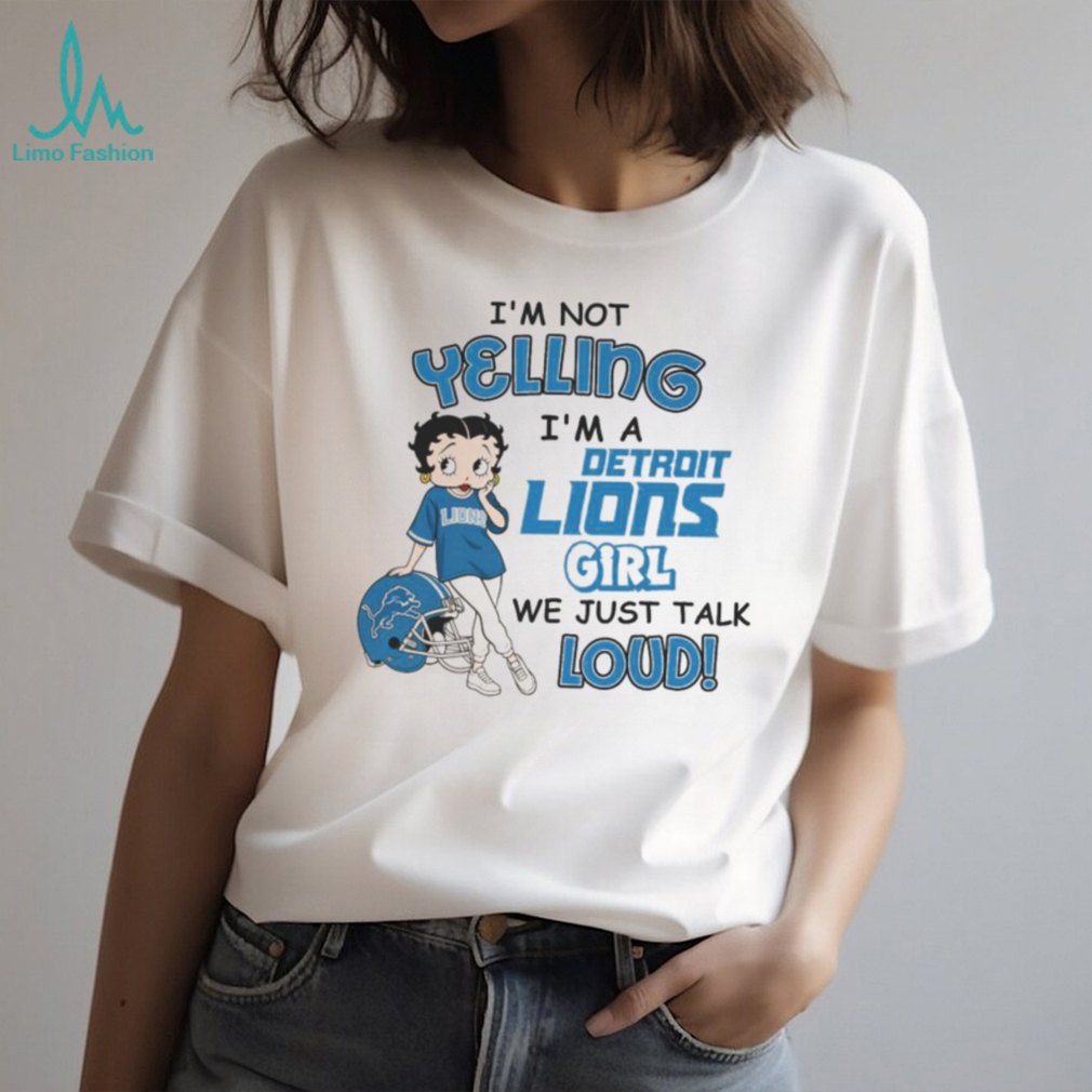 Show your Detroit Lions pride with a touch of classic cartoon charm! This “I’m Not Yelling” Betty Boop T-shirt is perfect for the passionate female fan who likes to stand out from the crowd. It’s a fun, spirited way to represent your team with a vintage twist.