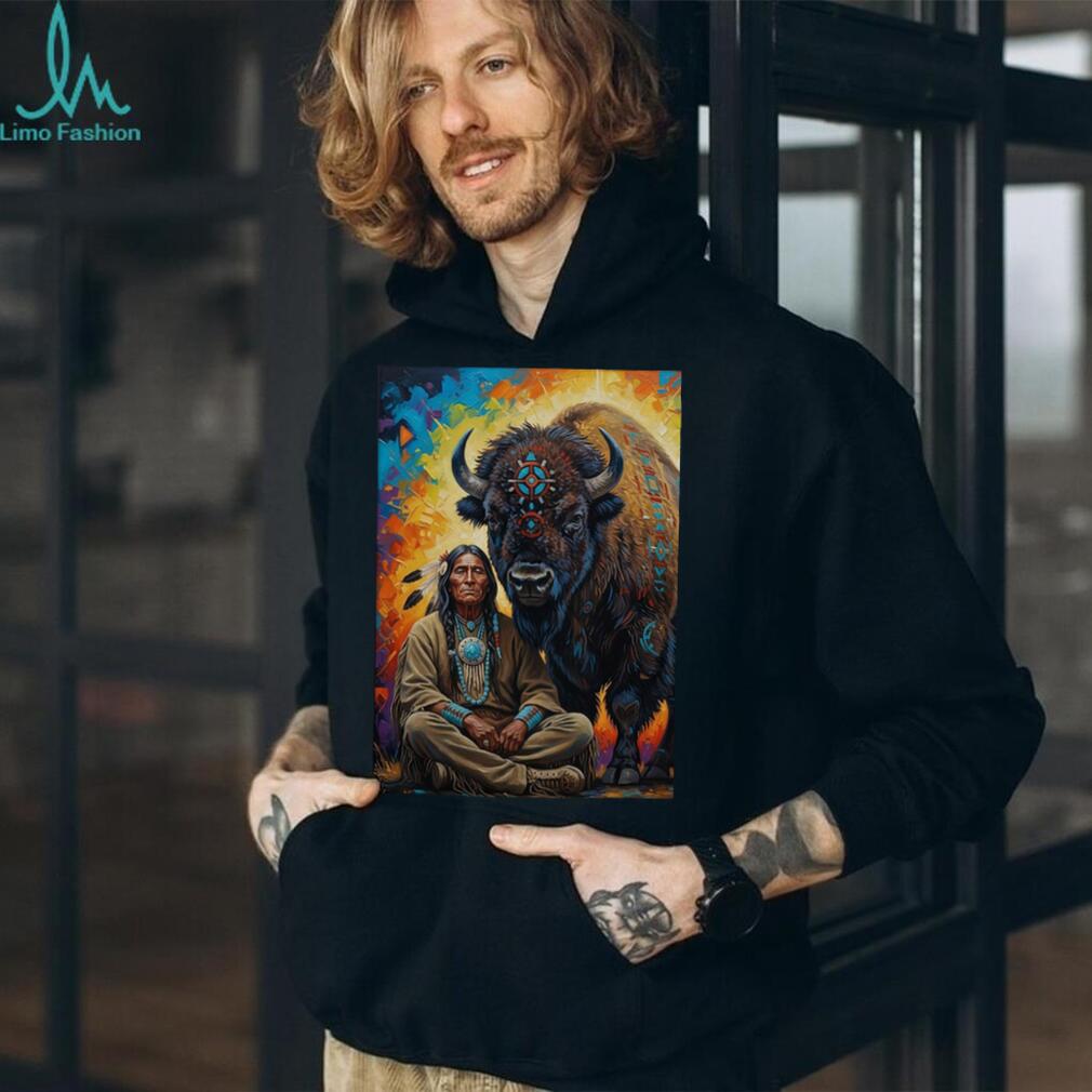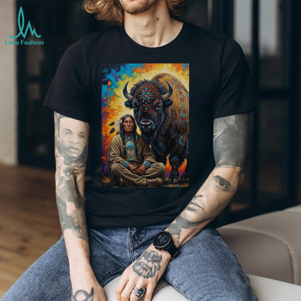 (Indigenous Spirit Wisdom Sitting Warrior & Buffalo T shirt)Indigenous Spirit Wisdom Sitting Warrior & Buffalo T shirt, Treat yourself or make a great gift for your loved ones