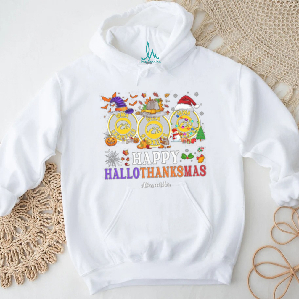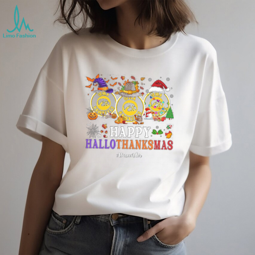 Iowa Hawkeyes Happy Hallothanksmas NCAA Football Shirt – Custom Name Holiday Gift Tee, Ugly Christmas Party Outfit for Families