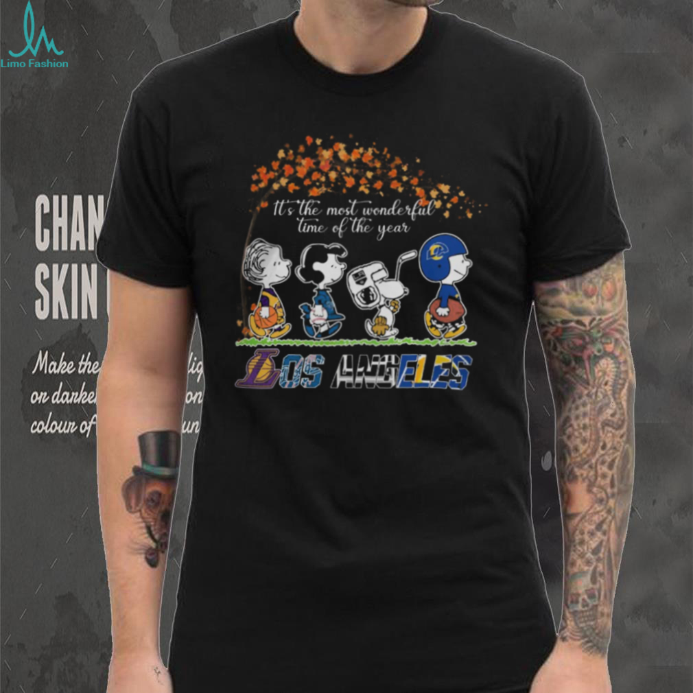 Celebrate the holidays with a touch of Los Angeles sports and the timeless charm of Peanuts! This unique “It’s The Most Wonderful Time Of The Year” T-shirt brings together your favorite Peanuts characters and iconic LA sports teams in a festive mashup. It’s the perfect way to show your team spirit and holiday cheer all season long.