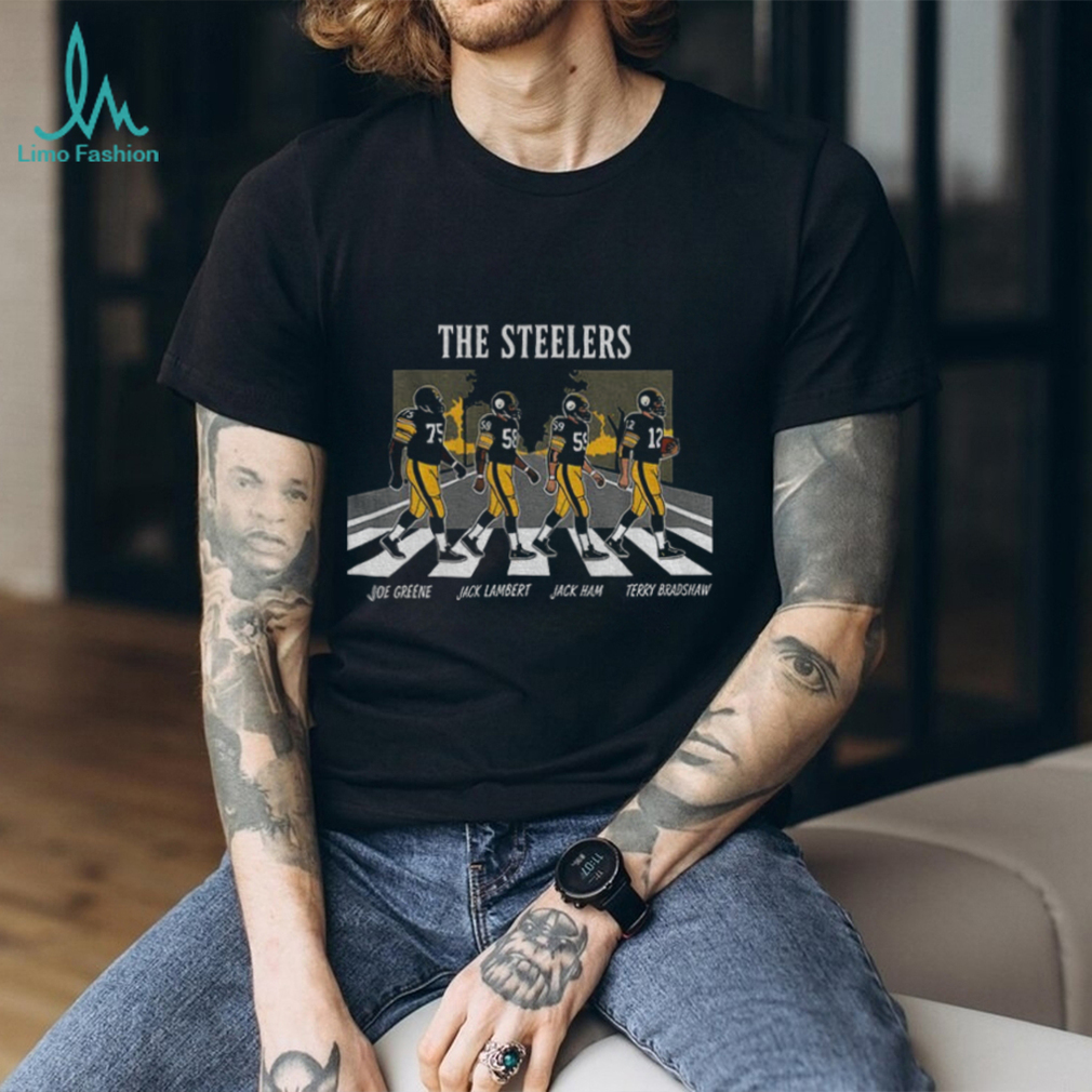 Pay homage to Pittsburgh Steelers greatness with this unique Abbey Road-inspired t-shirt! Featuring legendary players Joe Greene, Jack Lambert, Jack Ham, and Terry Bradshaw, it’s a must-have for any die-hard Steelers fan. Show your love for the Steel Curtain era!