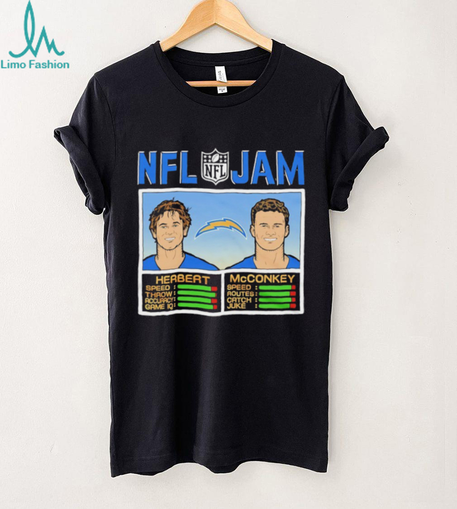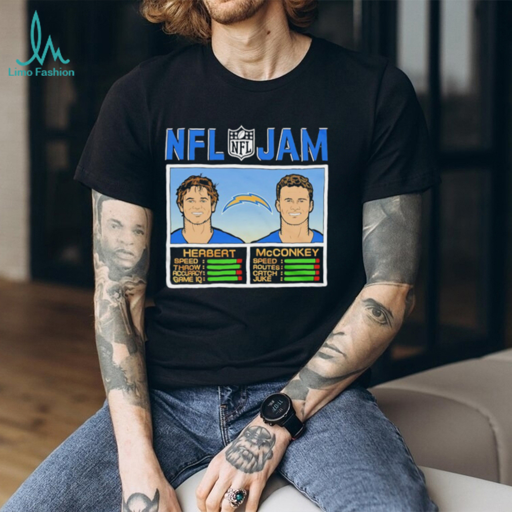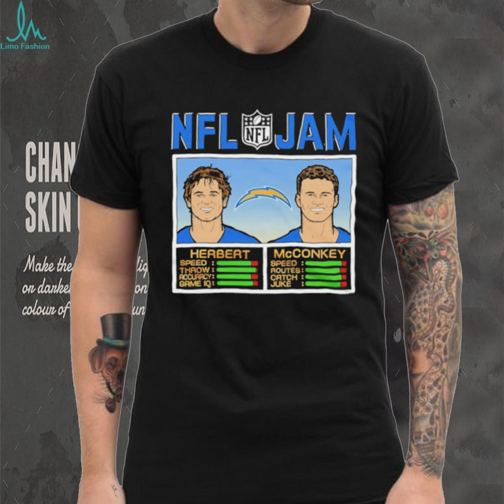 Score a touchdown of style with this unique shirt! This shirt brings together the excitement of NFL Jam with the dynamic duo of Ladd McConkey and Justin Herbert of the Los Angeles Chargers.