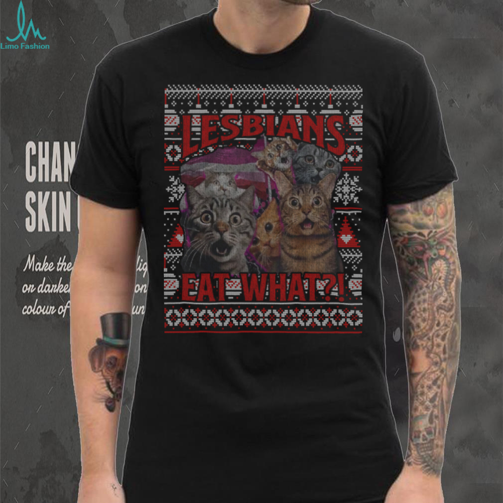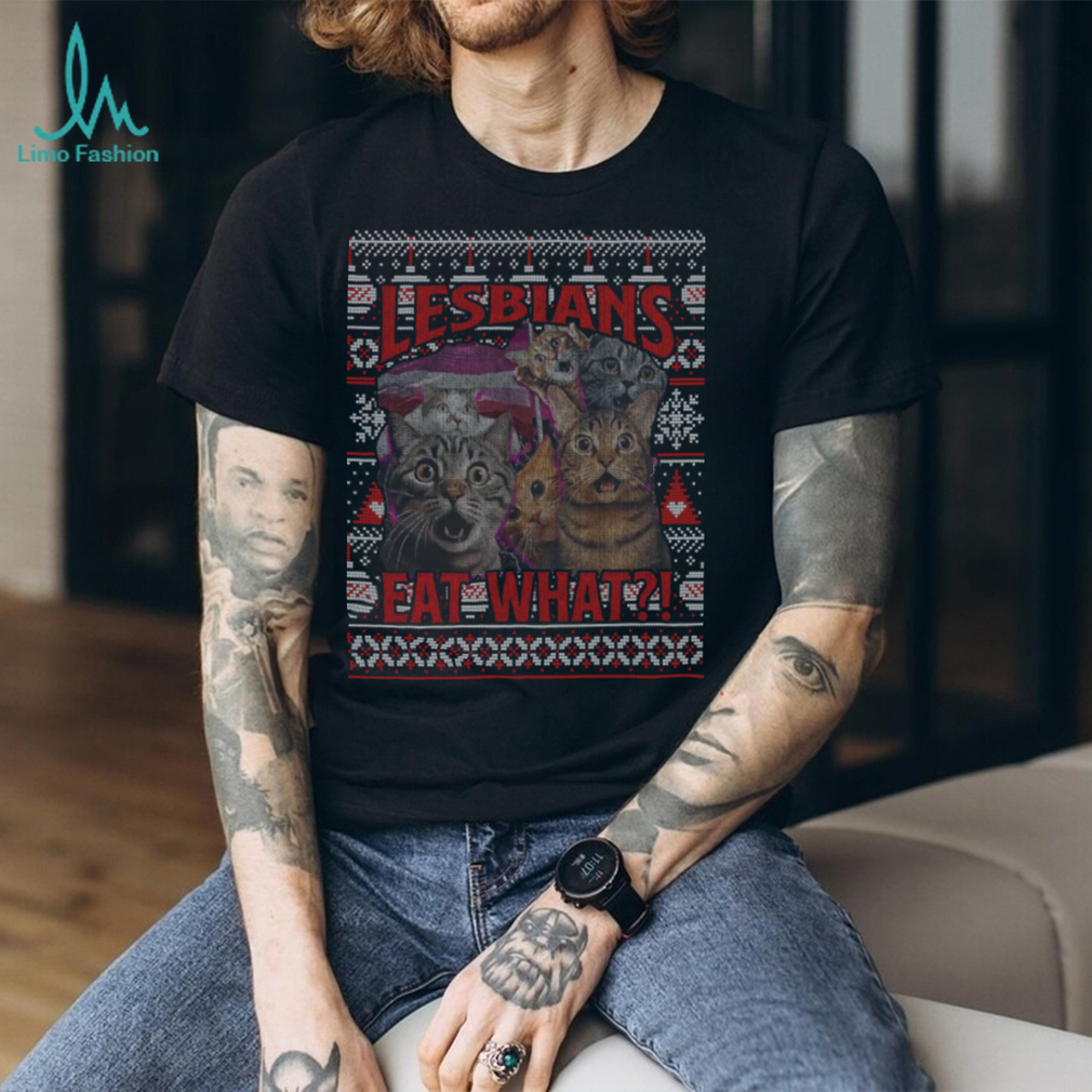 Looking for the purr-fect conversation starter this holiday season? This “Lesbians Eat What Funny Shocked Cats” Christmas Ugly Sweater Sweatshirt is guaranteed to get some laughs! If you’re a cat lover with a sense of humor and want to make a statement at your next holiday gathering, this sweatshirt is for you. Prepare for head-turns and giggles galore!
