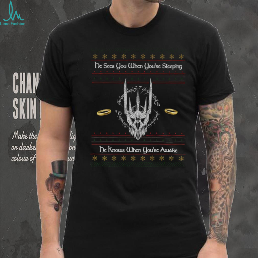 He knows when you are sleeping, he knows when you’re awake, and he definitely knows if you’ve been naughty or nice… It’s Sauron! This Lord of the Rings Christmas Sauron Eye he sees you when you’re sleeping shirt is a hilarious twist on a holiday classic. Perfect for the LOTR fan with a dark sense of humor, this tee is guaranteed to get some laughs (and maybe a few nervous glances) at your next holiday gathering.