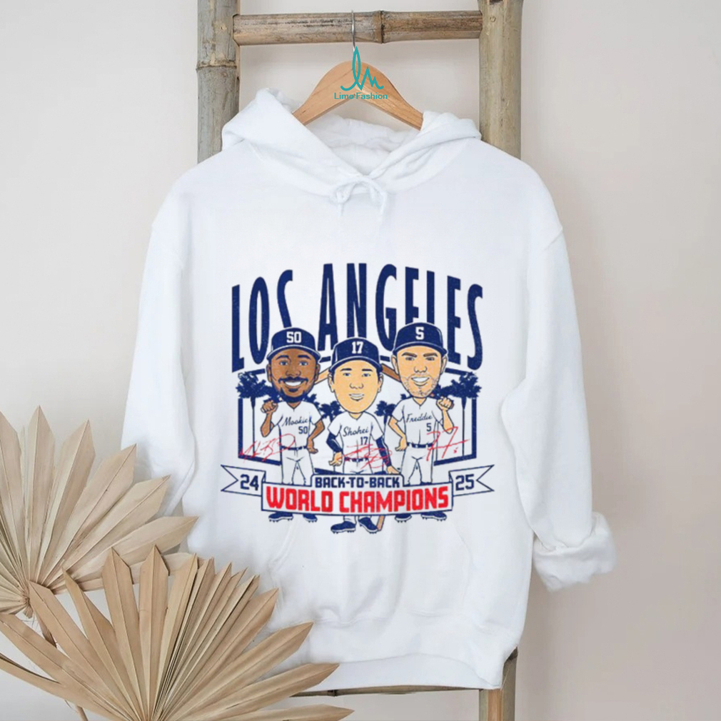 To keep your Los Angeles Dodgers Baseball Back to Back World Champions Caricatures 24 25 signature shirt looking vibrant, machine wash cold with similar colors and tumble dry low. Do not bleach, and avoid ironing directly on the graphic to preserve the artistic design.