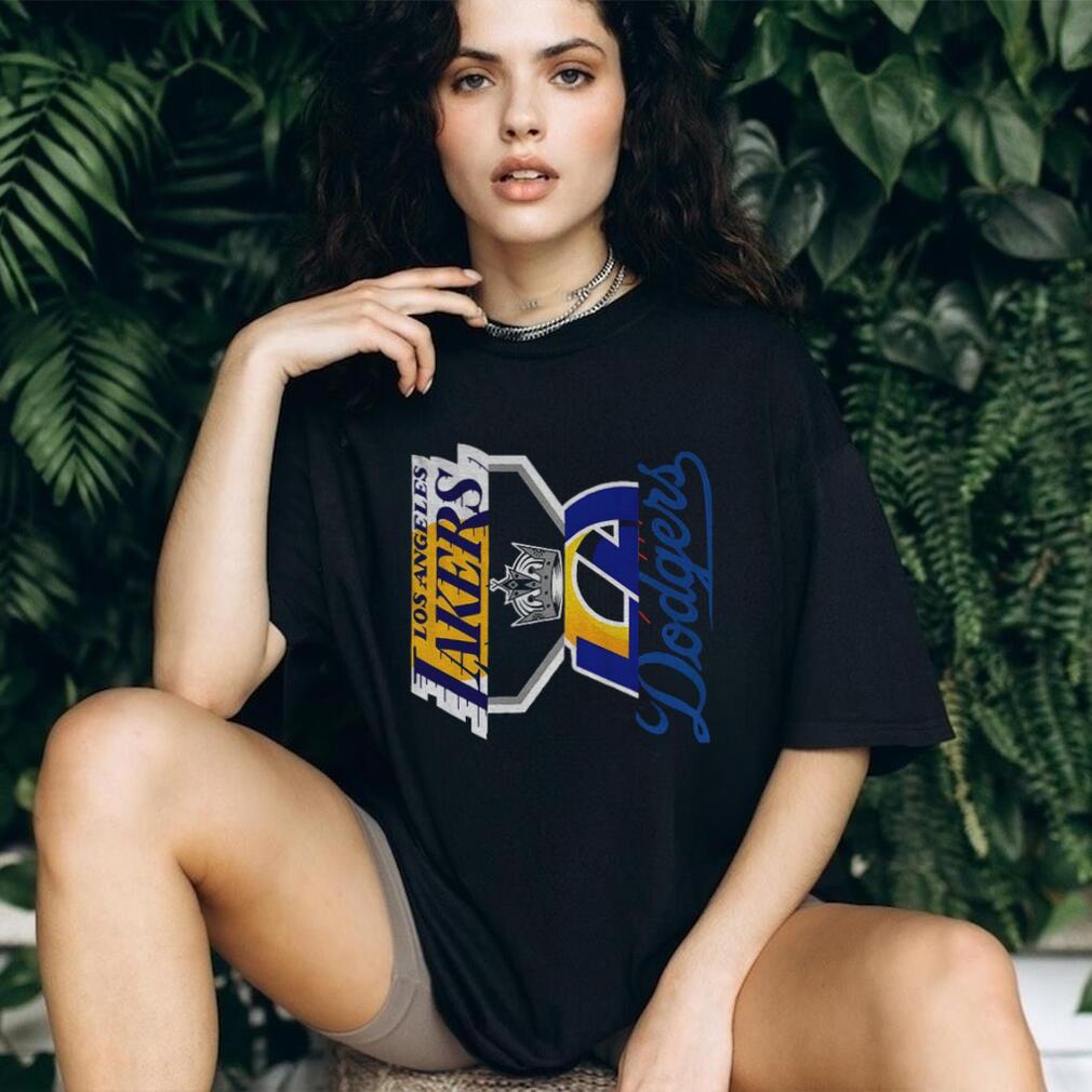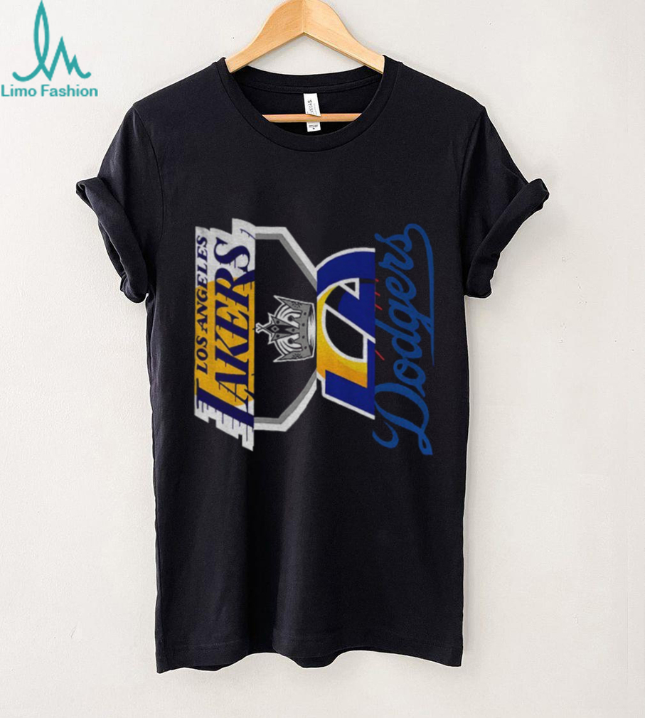 Show your love for Los Angeles sports with this awesome shirt! This shirt is for the true LA fan who bleeds Dodger blue, Kings black and silver, Lakers purple and gold, and Rams royal and sol. It’s a must-have for representing the city of champions!