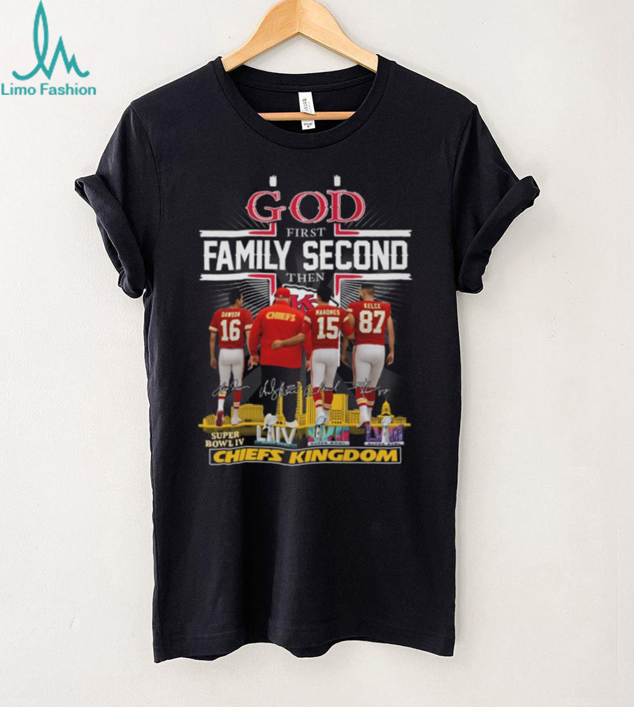Who Rocks This Mahomes, Kelce, Dawson God First Family Second Chiefs T Shirt Best