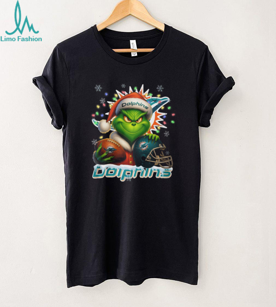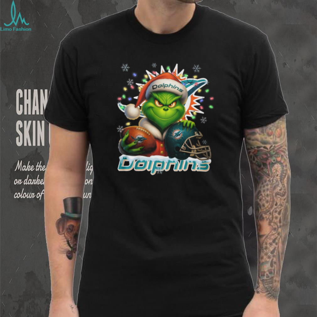 Need a conversation starter for the next Dolphins game or holiday party? This tee combines your love for the Miami Dolphins with the Grinch’s mischievous charm. Imagine the laughs and high-fives you’ll get! This shirt solves the problem of finding a unique and spirited way to support your team during the holiday season. It’s perfect for passionate Dolphins fans who want to stand out from the crowd. Made with a comfortable cotton blend, this shirt is perfect for all-day wear. Available in a range of sizes, it offers a comfortable fit for every fan.