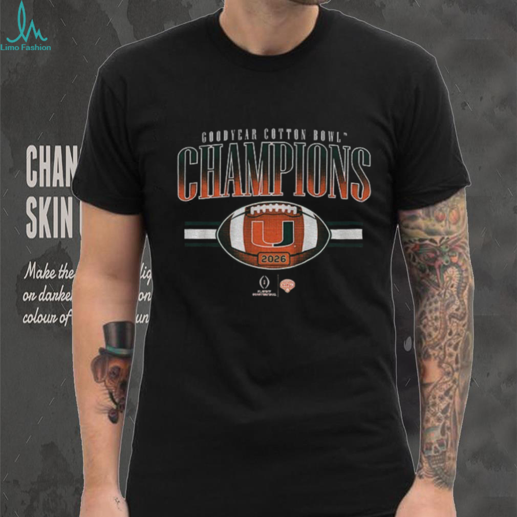The Miami Hurricanes football CFP Goodyear Cotton Bowl Champions 2025 logo shirt is designed for true champions. Featuring the authentic 2025 Goodyear Cotton Bowl Champions logo prominently displayed, this shirt is a symbol of hard-fought victory. Crafted from a comfortable cotton blend, it’s soft enough for all-day wear, whether you’re at the next game or just out and about. The durable print means your team’s accomplishment will shine brightly for years to come. Available in a range of sizes, you’ll find the perfect fit to showcase your Hurricanes pride.