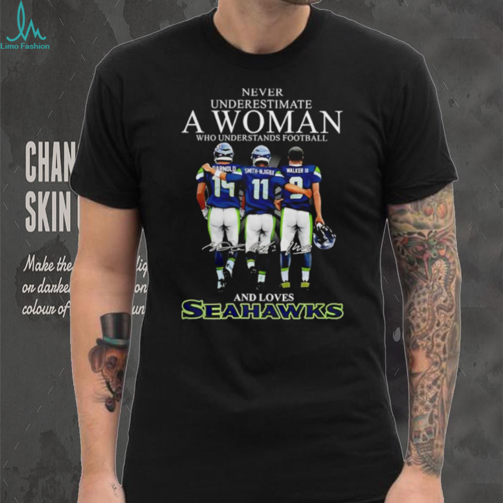 (Never Underestimate A Woman Who Loves Seahawks Football T Shirt)If I had to bet any amount of money on any dynasty lasting in the AFC by 2026, the Kansas City Chiefs are the safest answer. Plus Patrick Mahomes is probably still the best QB in the league for pulling out wins and Buffalo and Baltimore have proven year after year they just can’t beat the Chiefs in the playoffs. Only team with a chance of upending them would be the Bengals if their defense is much improved over last year. Don’t expect much from teams with veteran quarterbacks, they get worse as they get older. Mahomes is young and thriving, and he sells more Never Underestimate A Woman Who Loves Seahawks Football T Shirt than almost any other athlete in the country. I expect more dynasties to emerge but it may not be the case, just look at the Texans for an allstar QB on a dead team. The Ravens, Browns, and Bills look promising for now. Maybe some team sucks terribly from 2021–2024, gathers talent in 2025, then explodes in 2026. A few players currently in high school will make waves in college and end up on a team like the Lions, bringing the franchise its first Super Bowl berth ever in 2026.
