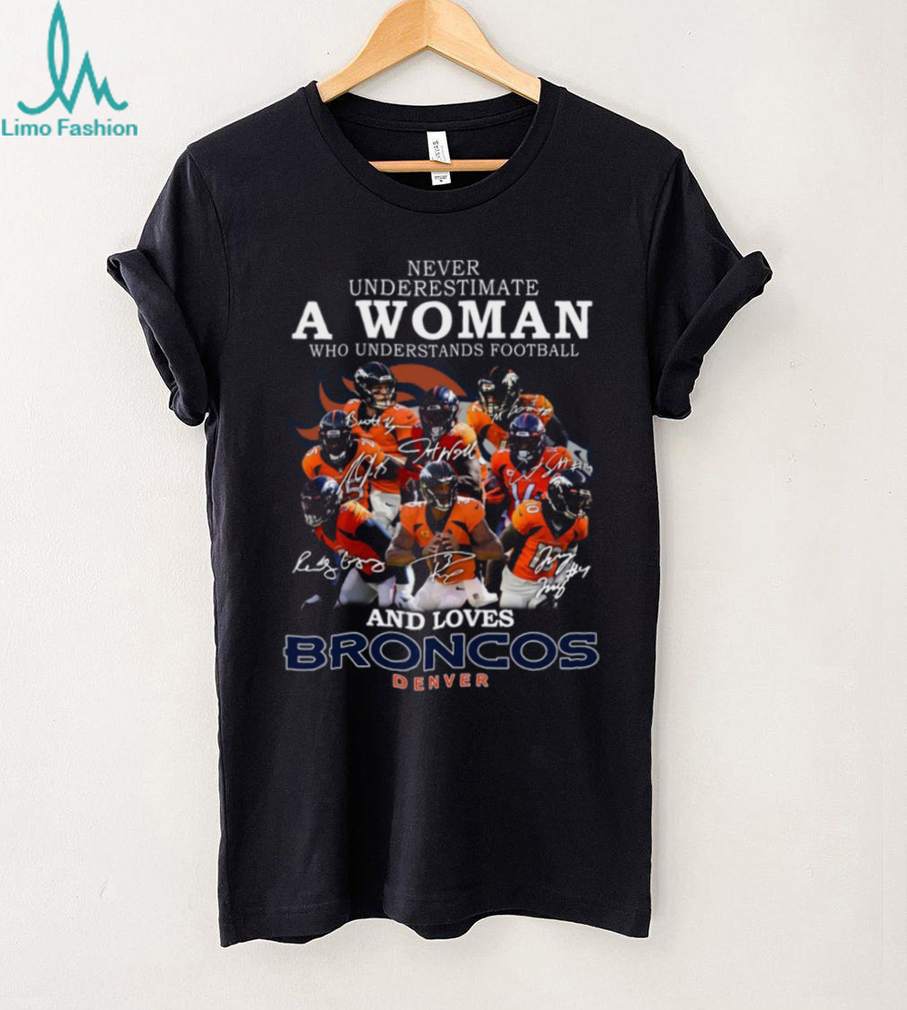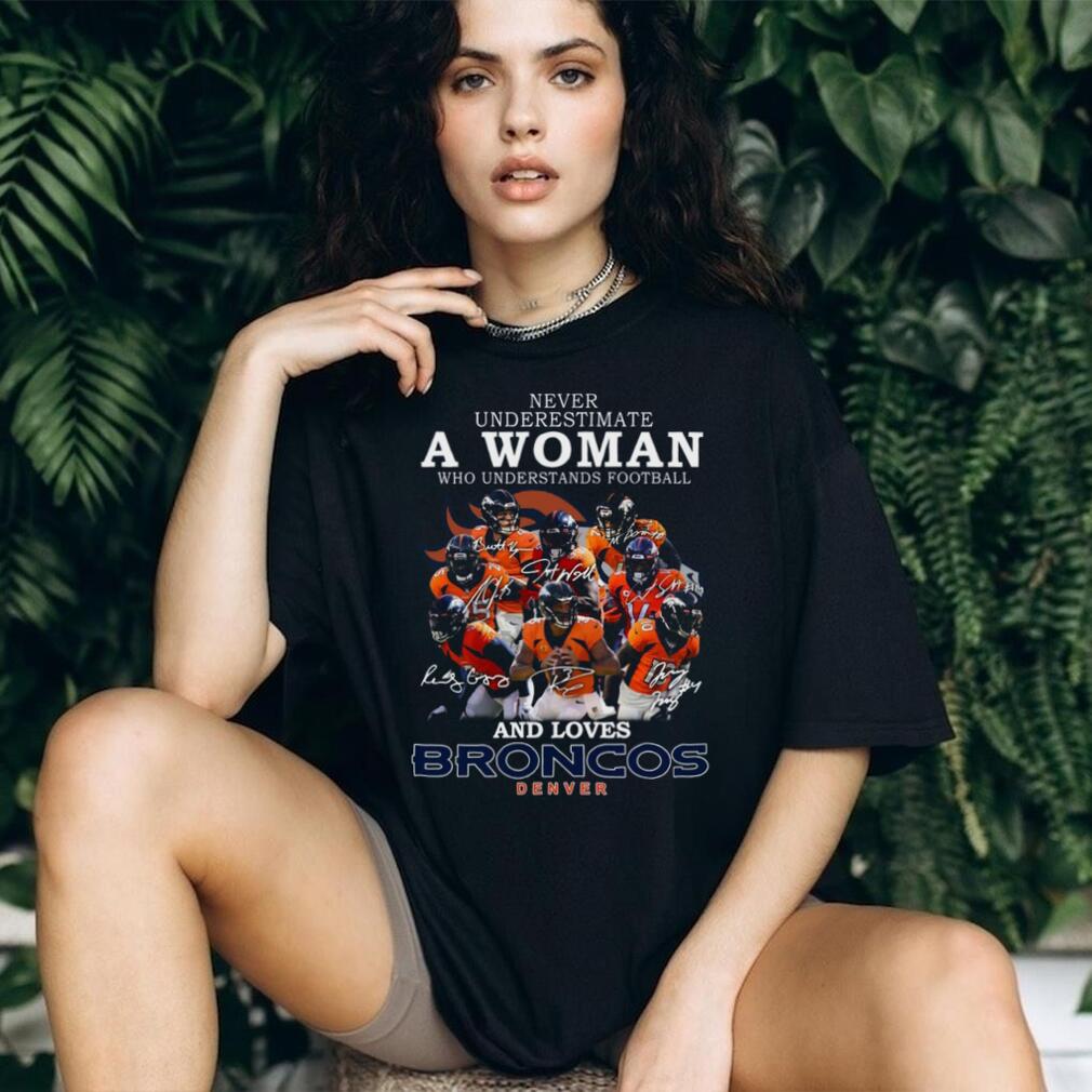 To keep your “Never Underestimate a Woman Who Understands Football and Loves Denver Broncos T Shirt” looking its best, wash inside out in cold water with similar colors. Tumble dry low or hang dry. Avoid ironing directly on the design. This simple care routine helps maintain the shirt’s vibrant print and comfortable feel, ensuring your empowering Broncos tee remains a cherished item in your wardrobe.