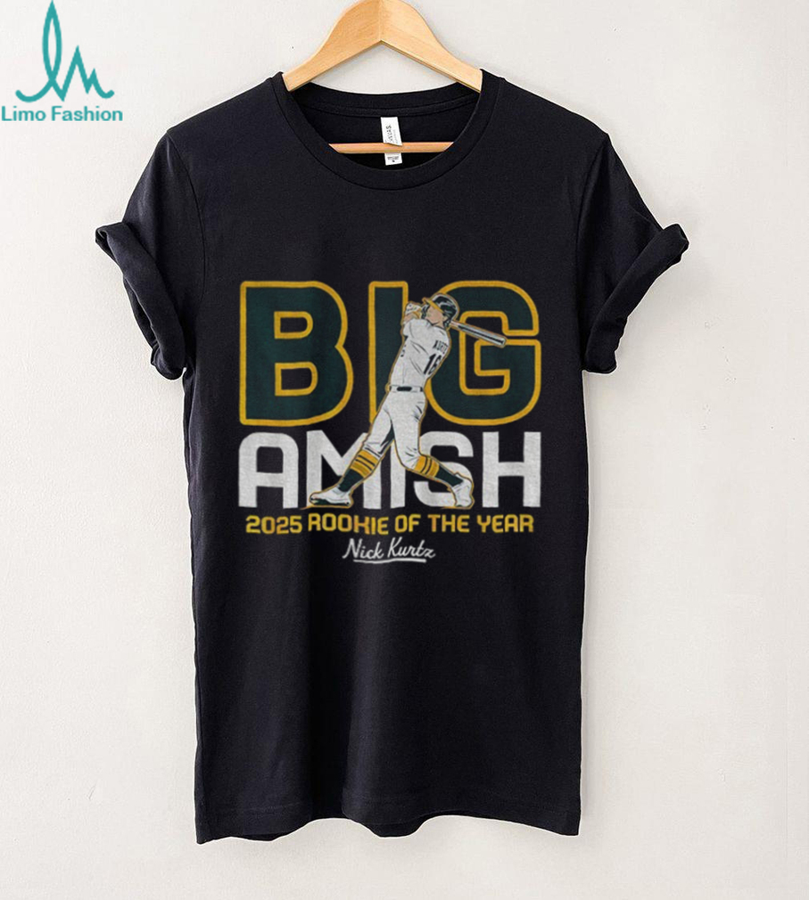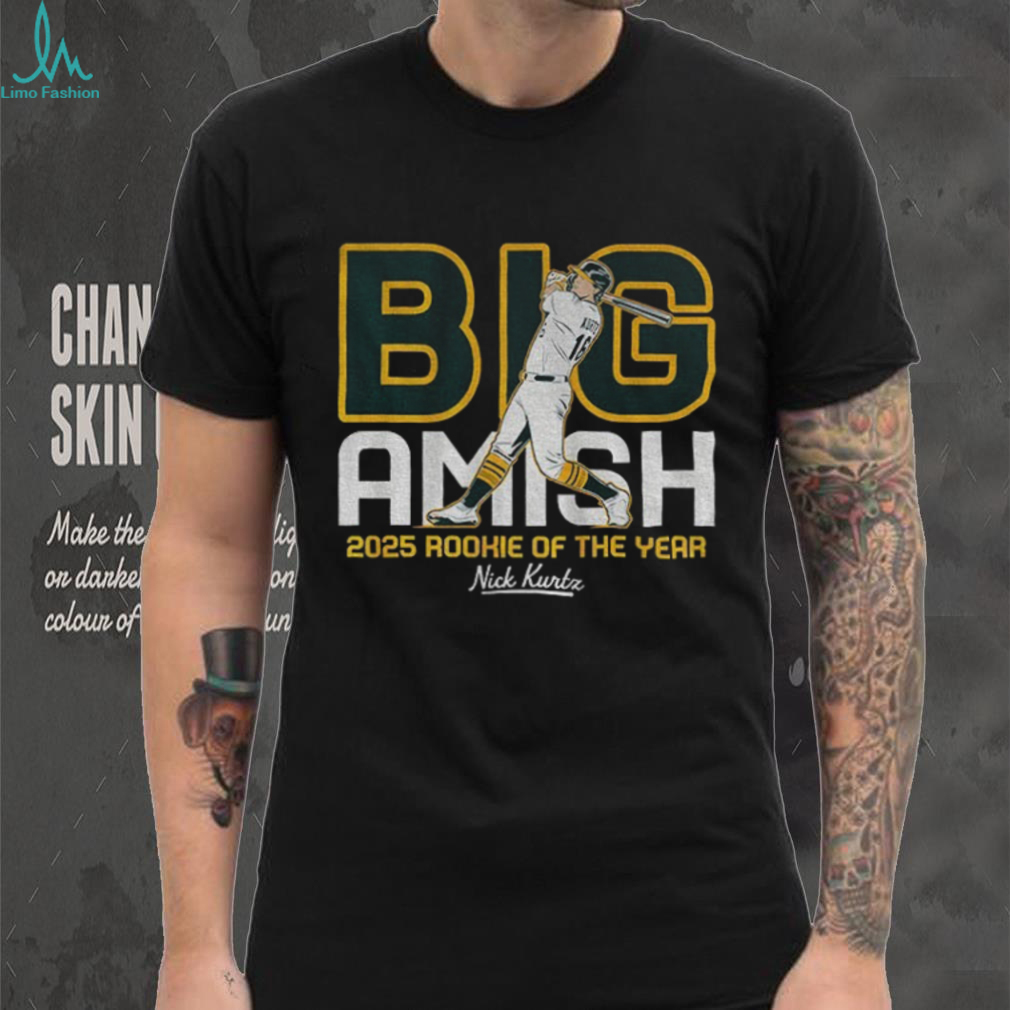 Celebrate the rise of a baseball star with the Nick Kurtz Oakland Athletics MLB Baseball Big Amish Rookie of the Year shirt. This tee is a perfect way to show your support for the young talent and the team.