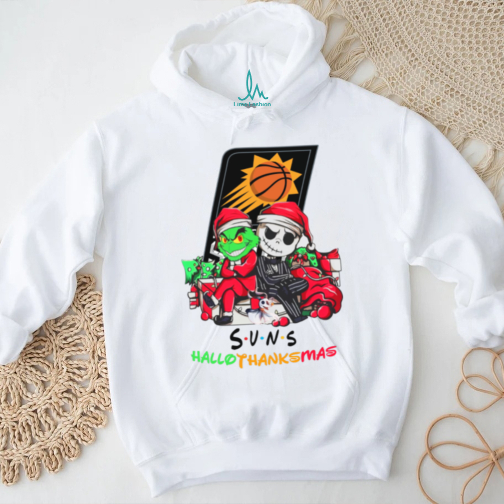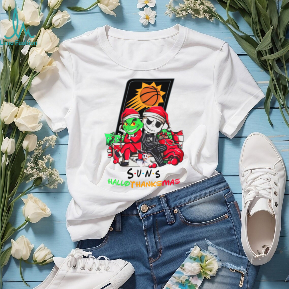 This Official Baby Grinch And Jack Skellington Phoenix Suns Logo Hallothanksmas 2024 T Shirt is perfect for fans of the Phoenix Suns, lovers of The Nightmare Before Christmas, or anyone who enjoys a fun, unique design.