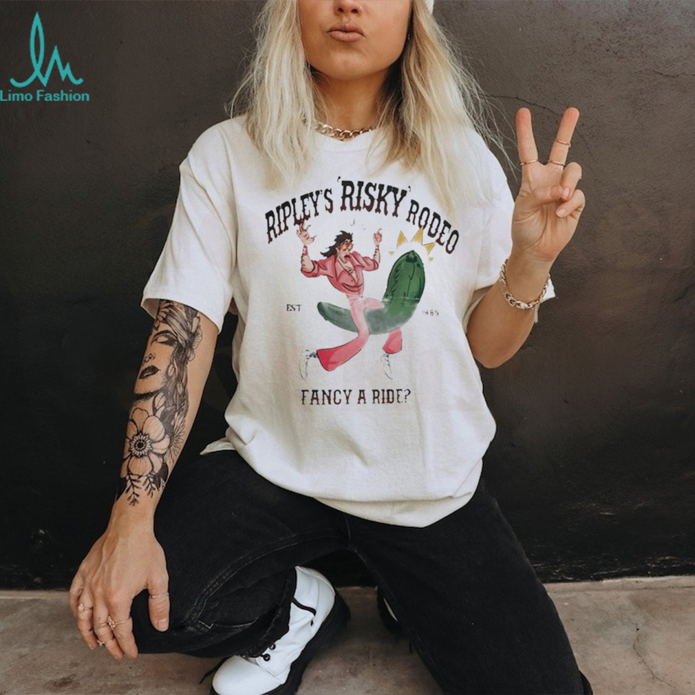 Step right up and get your Official Ripley’s Risky Rodeo “Fancy A Ride” 1969 Shirt! This unique tee captures the spirit of vintage rodeo thrills and oddities. Perfect for fans of Ripley’s Believe It or Not! and anyone who loves a touch of the strange and wonderful, this shirt is a conversation starter wherever you go.