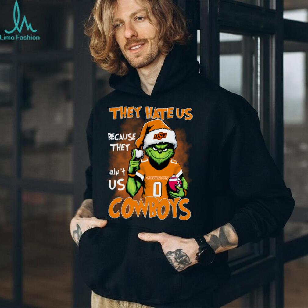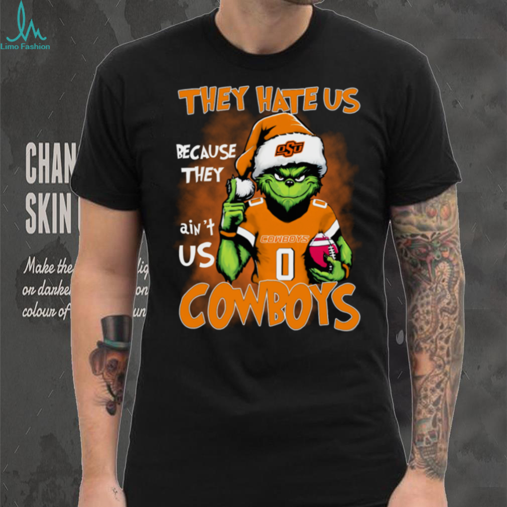 To keep your Official “The Grinch They Hate Us Because Ain’t Us” Oklahoma State Cowboys Christmas Shirt looking its best, machine wash it inside out with cold water. Tumble dry on low or hang it up to dry to preserve the design’s quality. Avoid using bleach or ironing directly on the print. With proper care, this shirt will be a cherished part of your Cowboys game day and holiday wardrobe for years to come!