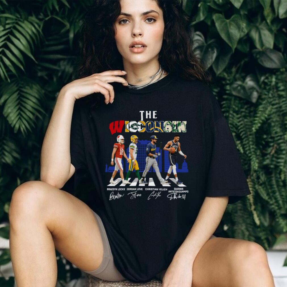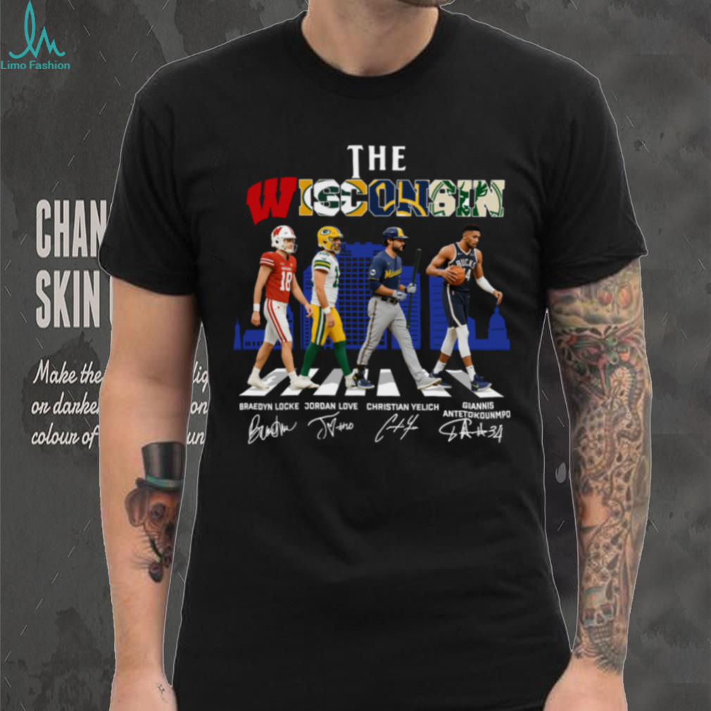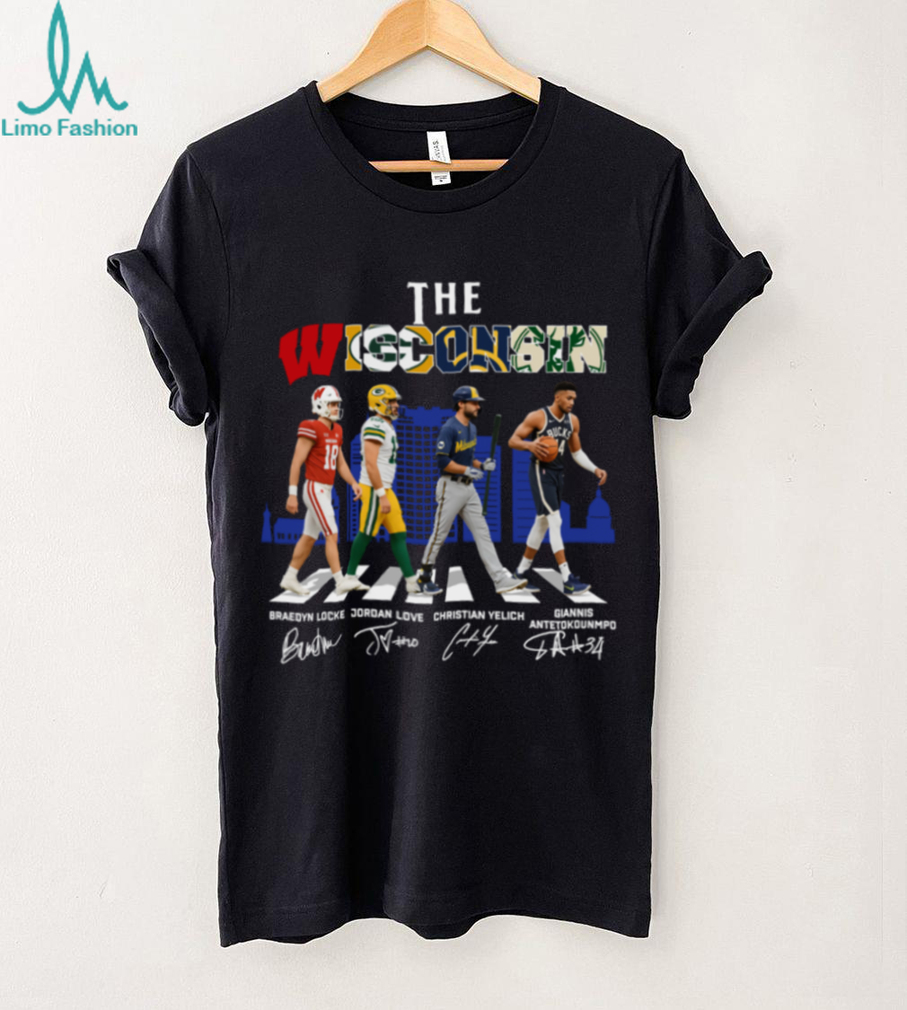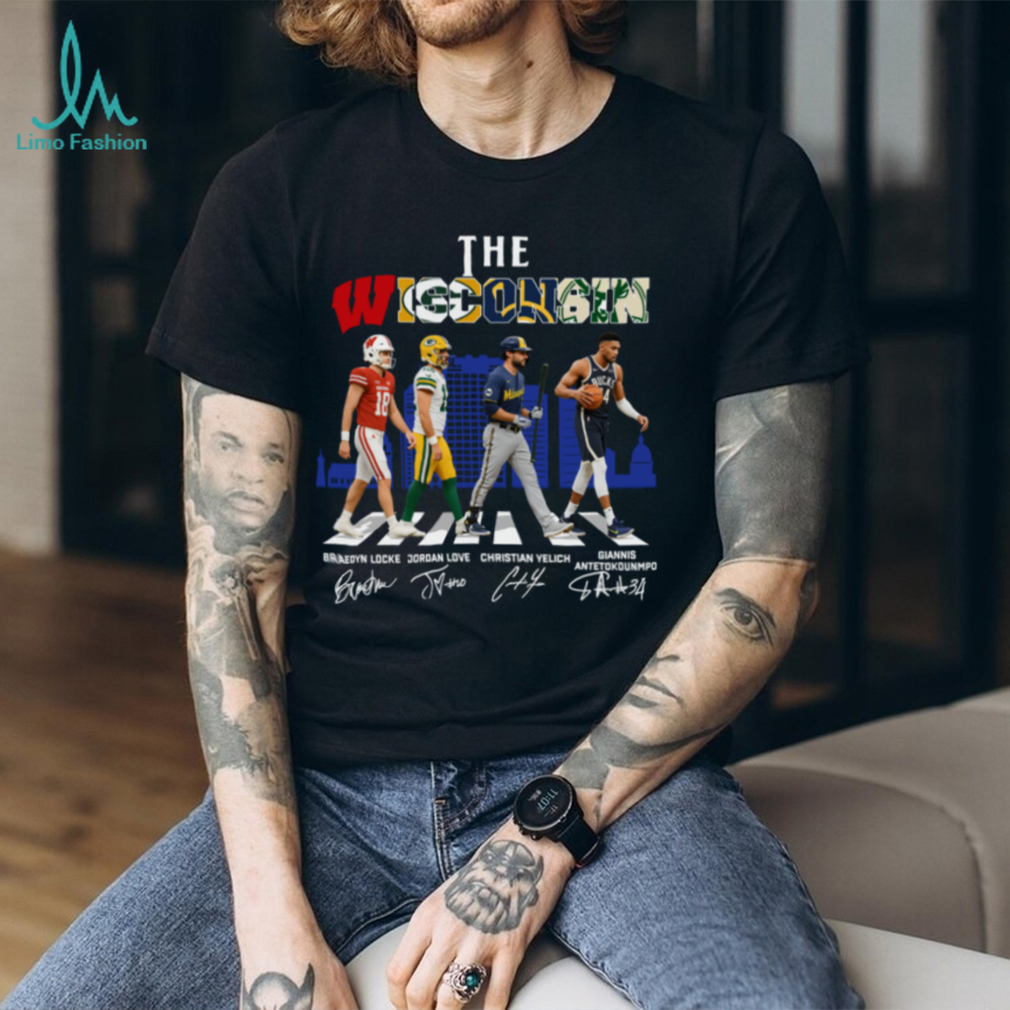 Show your Wisconsin pride with this unique hoodie featuring signatures of iconic athletes: Locke, Love, Yelich, and Antetokounmpo. A perfect way to represent all your favorite Wisconsin sports teams in one stylish design!