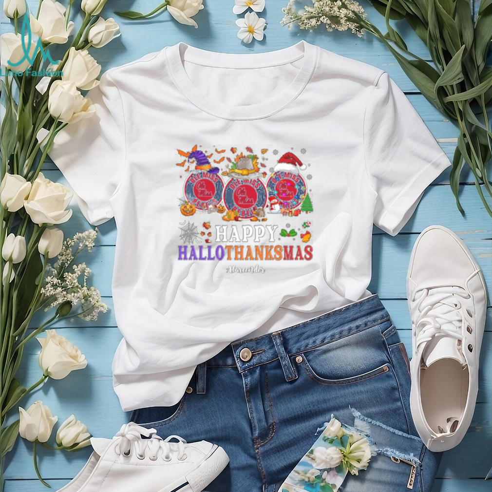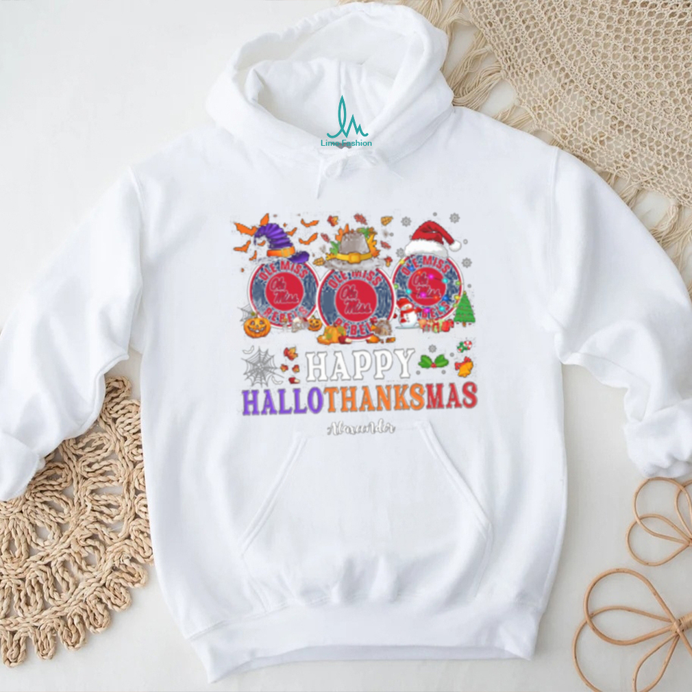 Ole Miss Rebels Happy Hallothanksmas Tee – Custom Name NCAA Football Shirt, Holiday Gift for Fans, Ugly Christmas Outfit Idea