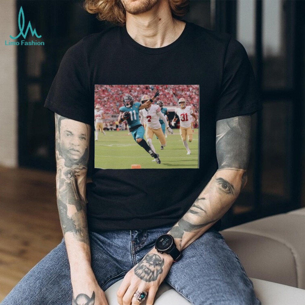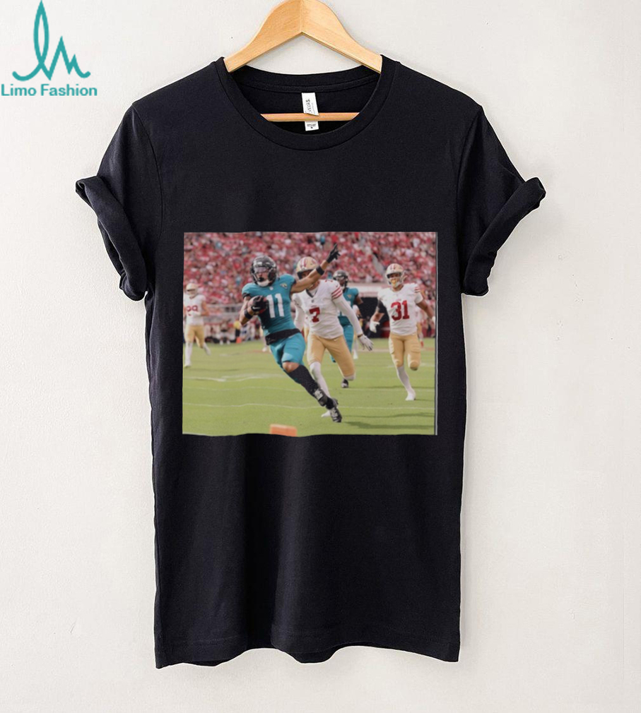 Celebrate Parker Washington’s standout performance with this official Jacksonville Jaguars NFL Flash Features Week 4 T-shirt! This isn’t just a shirt; it’s a tribute to a rising star and a symbol of your unwavering support for the Jaguars. Show your team spirit and commemorate Washington’s impact on the game. If you’re a die-hard Jaguars fan, this shirt is your chance to represent your team and favorite player in style!