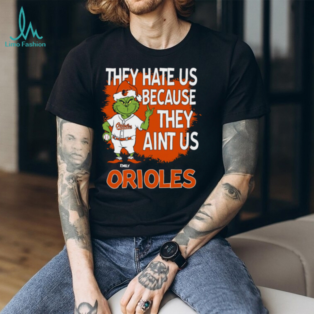 Personalized Baltimore Orioles Grinch Christmas Tee, Santa Baseball Shirt with Quote They Hate Us Ain’t Us, Funny MLB Gift