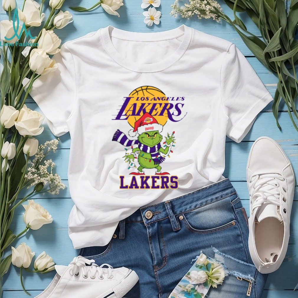Personalized Lakers Christmas Shirt, Grinch Santa Hat Holiday Tee with Lights Scarf, Cute NBA Basketball Gift for Fans