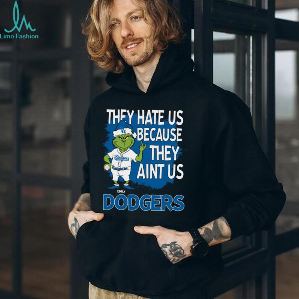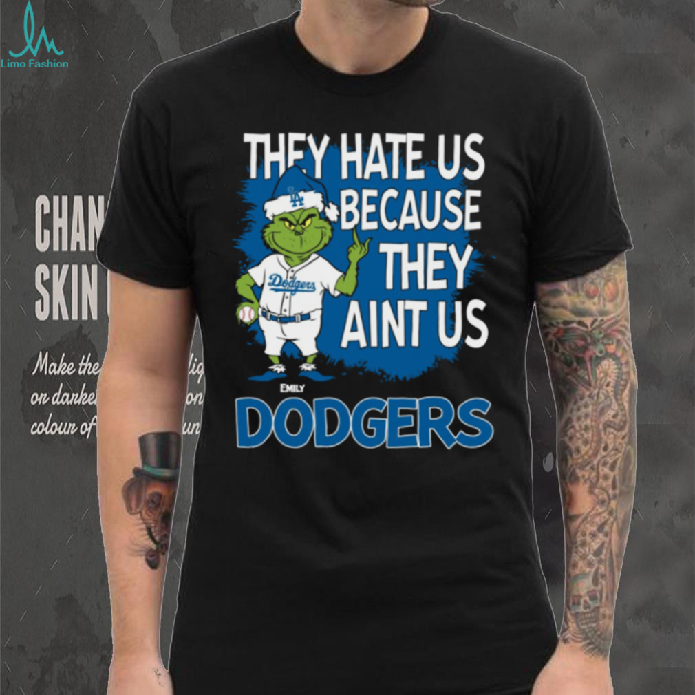 Personalized Los Angeles Dodgers Christmas Tee, Grinch Santa Baseball Shirt with Quote They Hate Us Ain’t Us, Funny MLB Gift