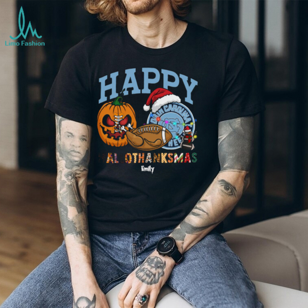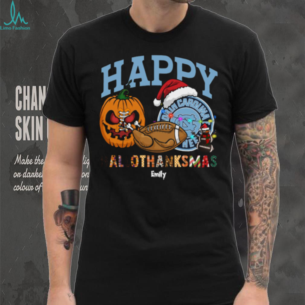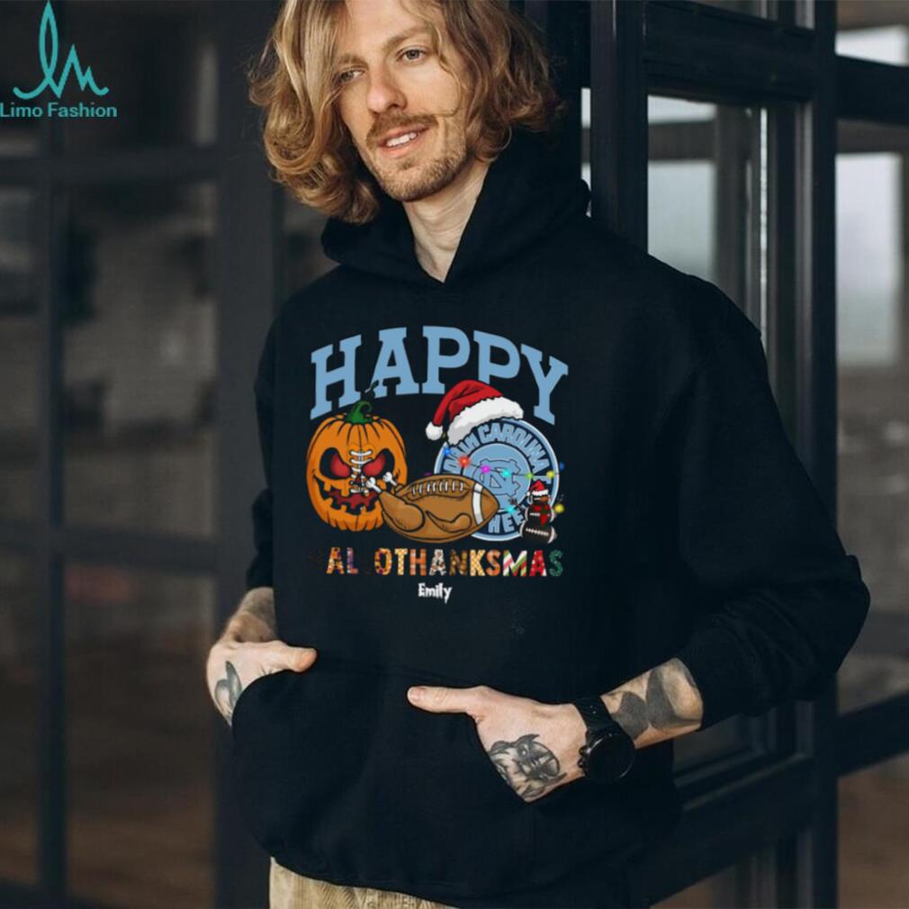 Personalized North Carolina Tar Heels HalloThanksMas Tee, Funny Holiday Shirt with Pumpkin Santa Hat Football, NCAA Fan Gift for Halloween Thanksgiving Christmas